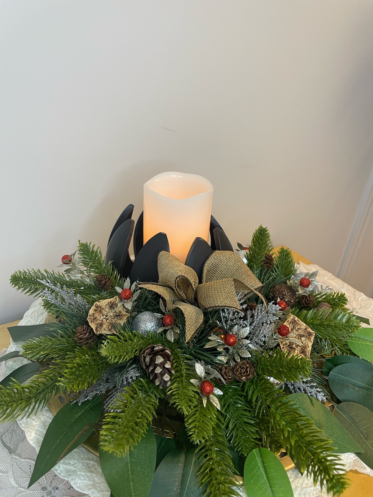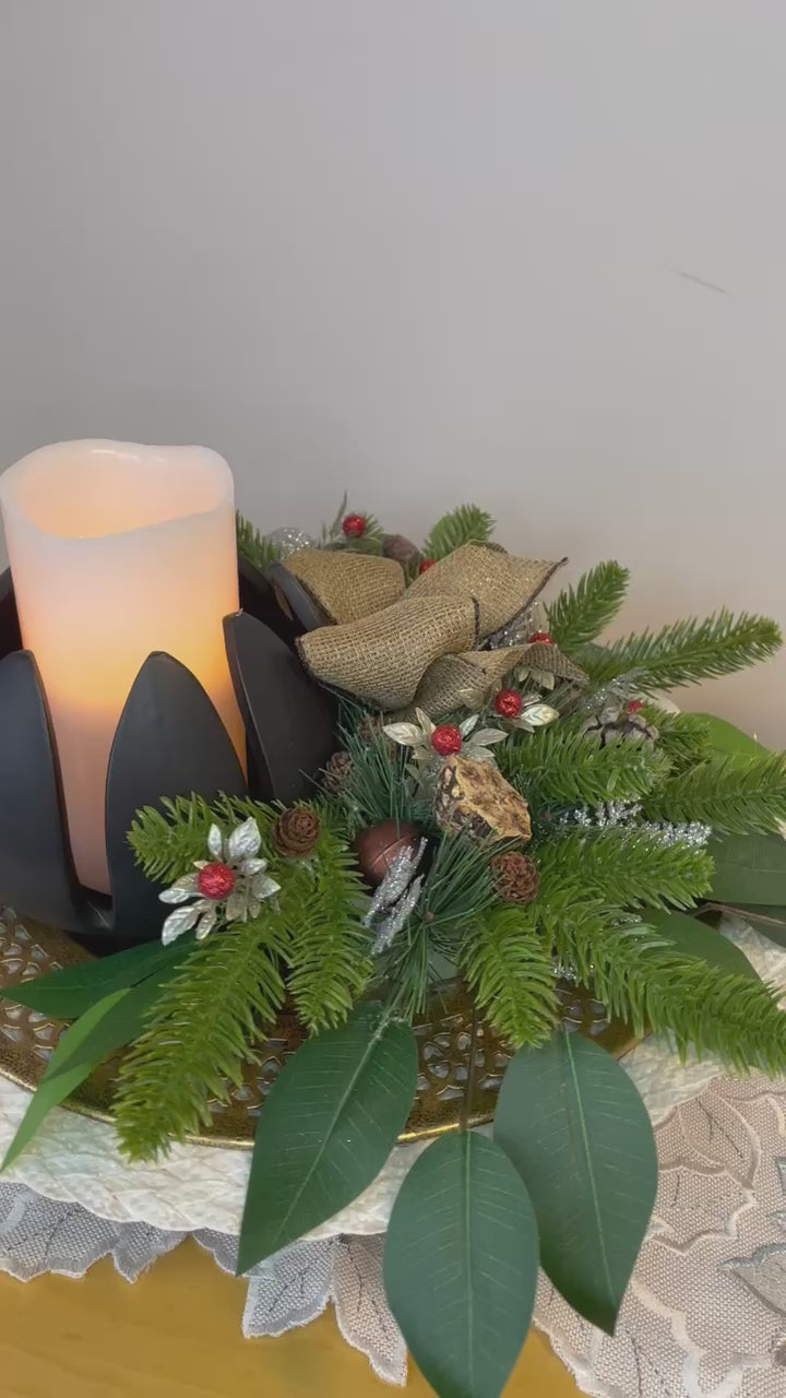 Enjoy the charming colors and enchanting patterns of this "La Forest Enchantée" centerpiece to brighten up any room. The LED candle, gold metal tray and green foliage provide a timeless elegance. The artificial pine trees bring a magical touch to your decor. Marvel!
