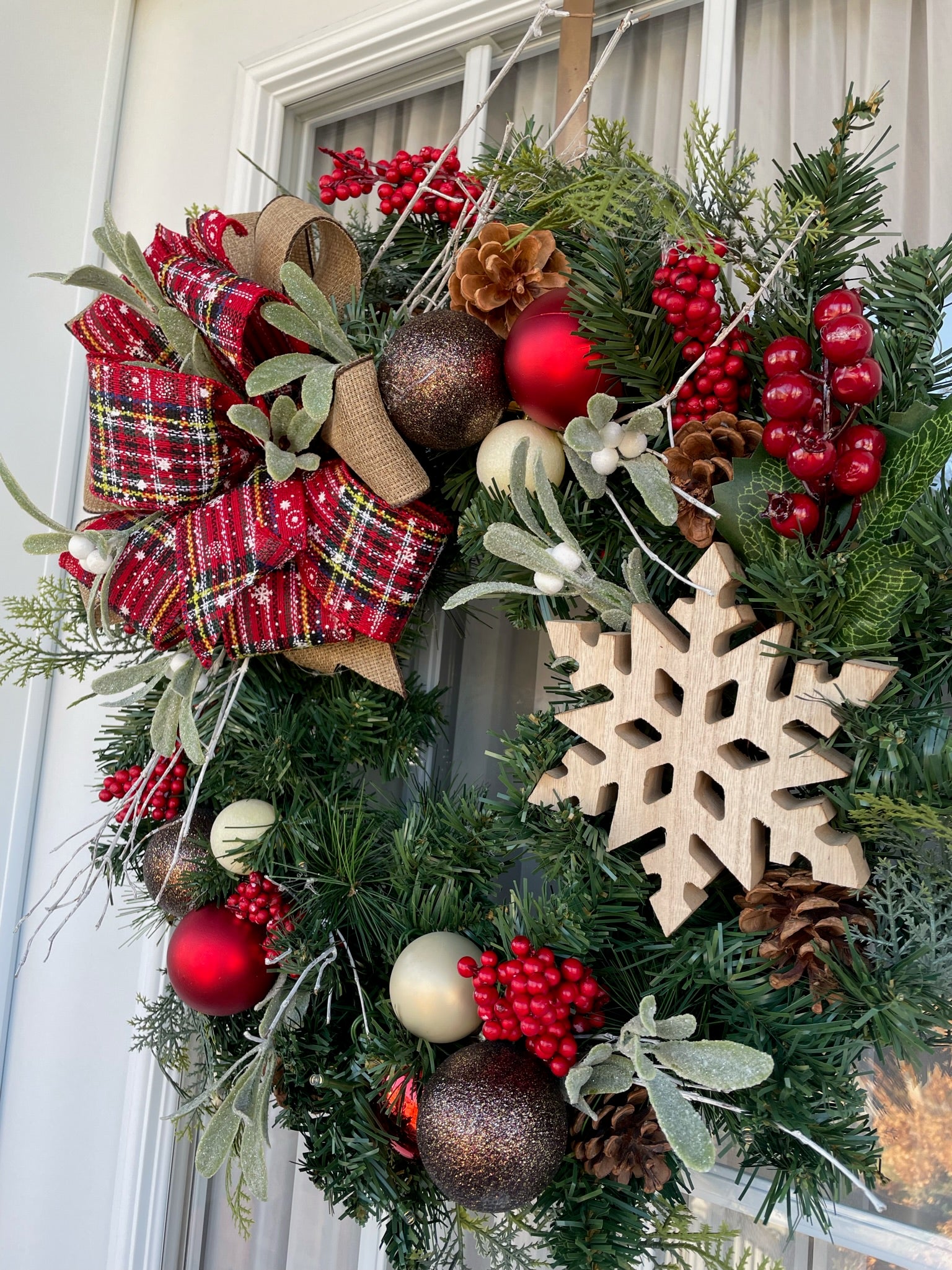 24 inch CHRISTMAS wreath handmade with new materials on artificial fir wreath. Integrated warm white lights.