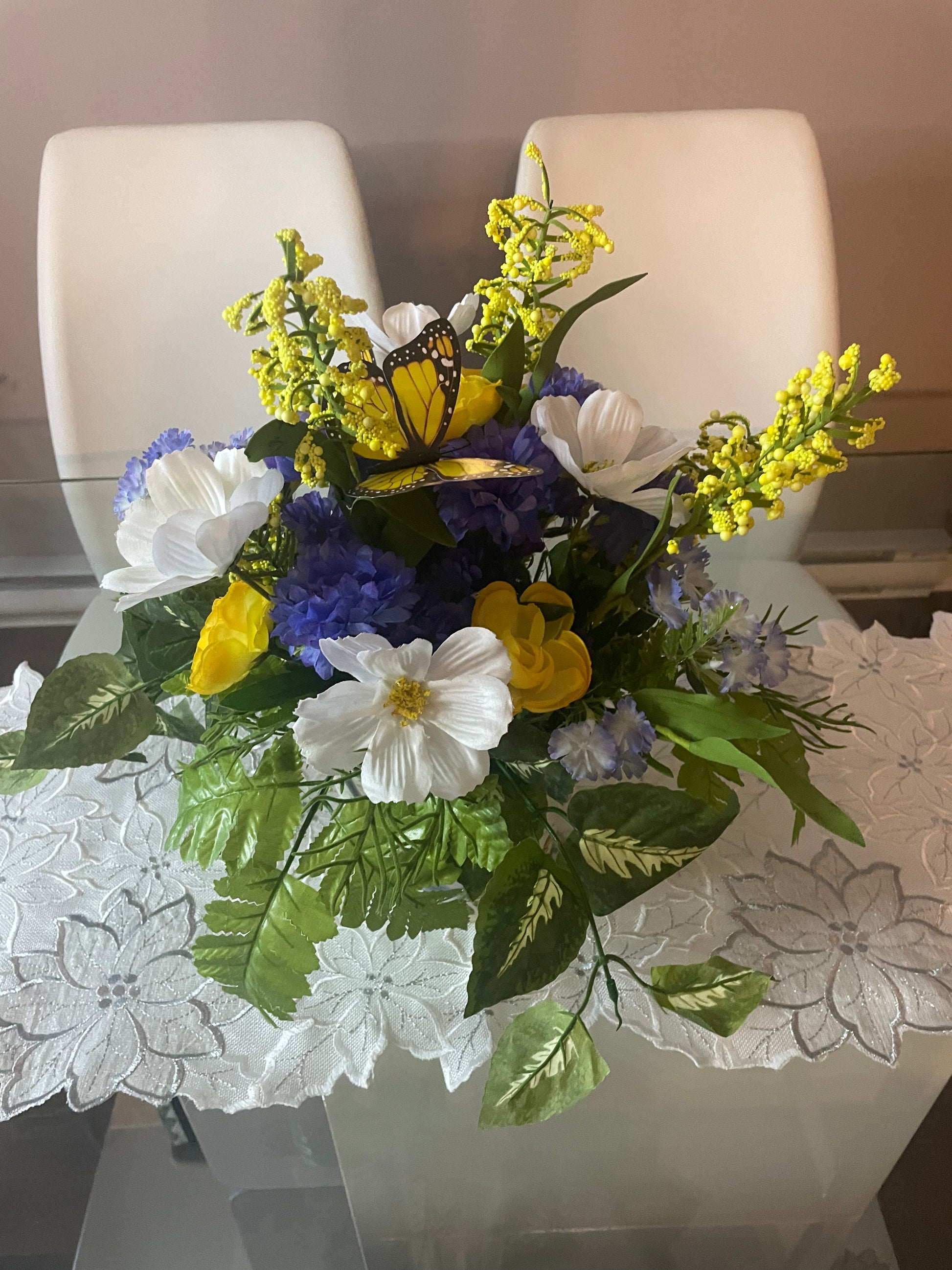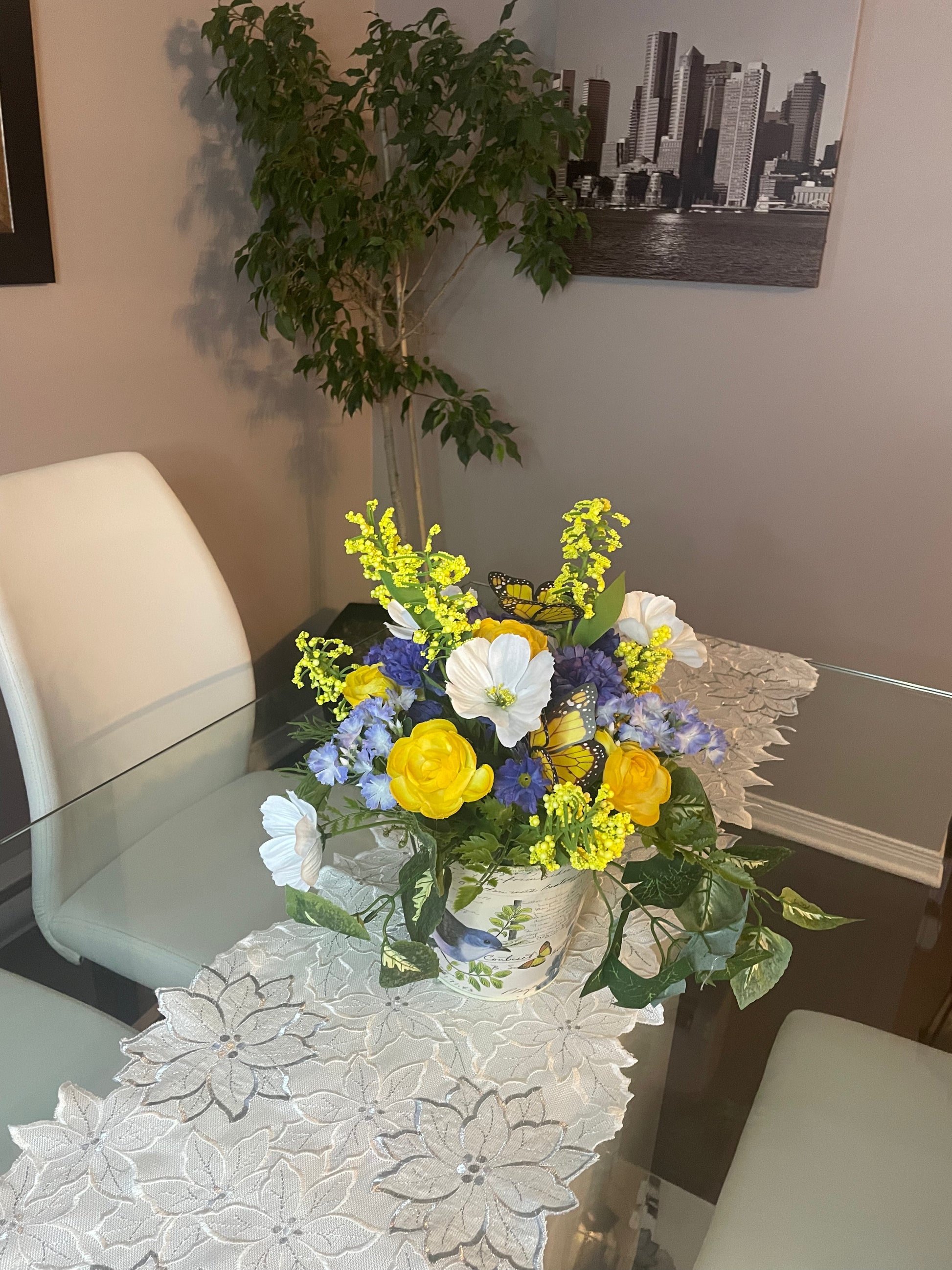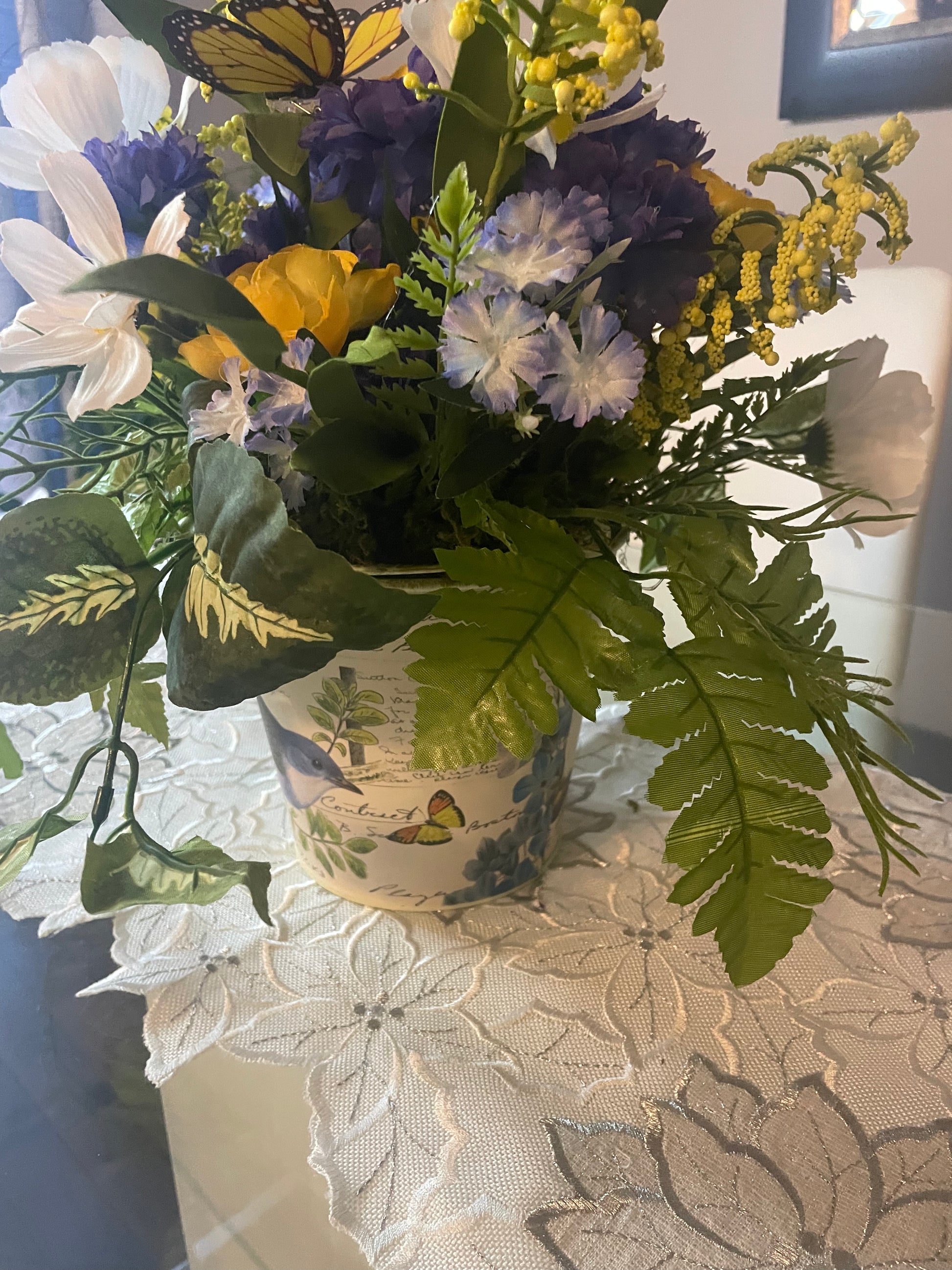This arrangement with its metal bucket with spring motifs will be present in your home for a long life with its artificial flowers.