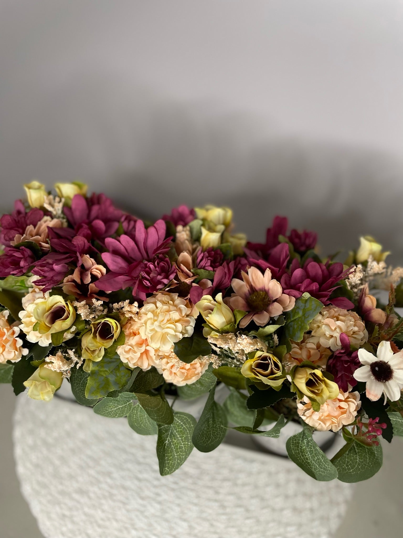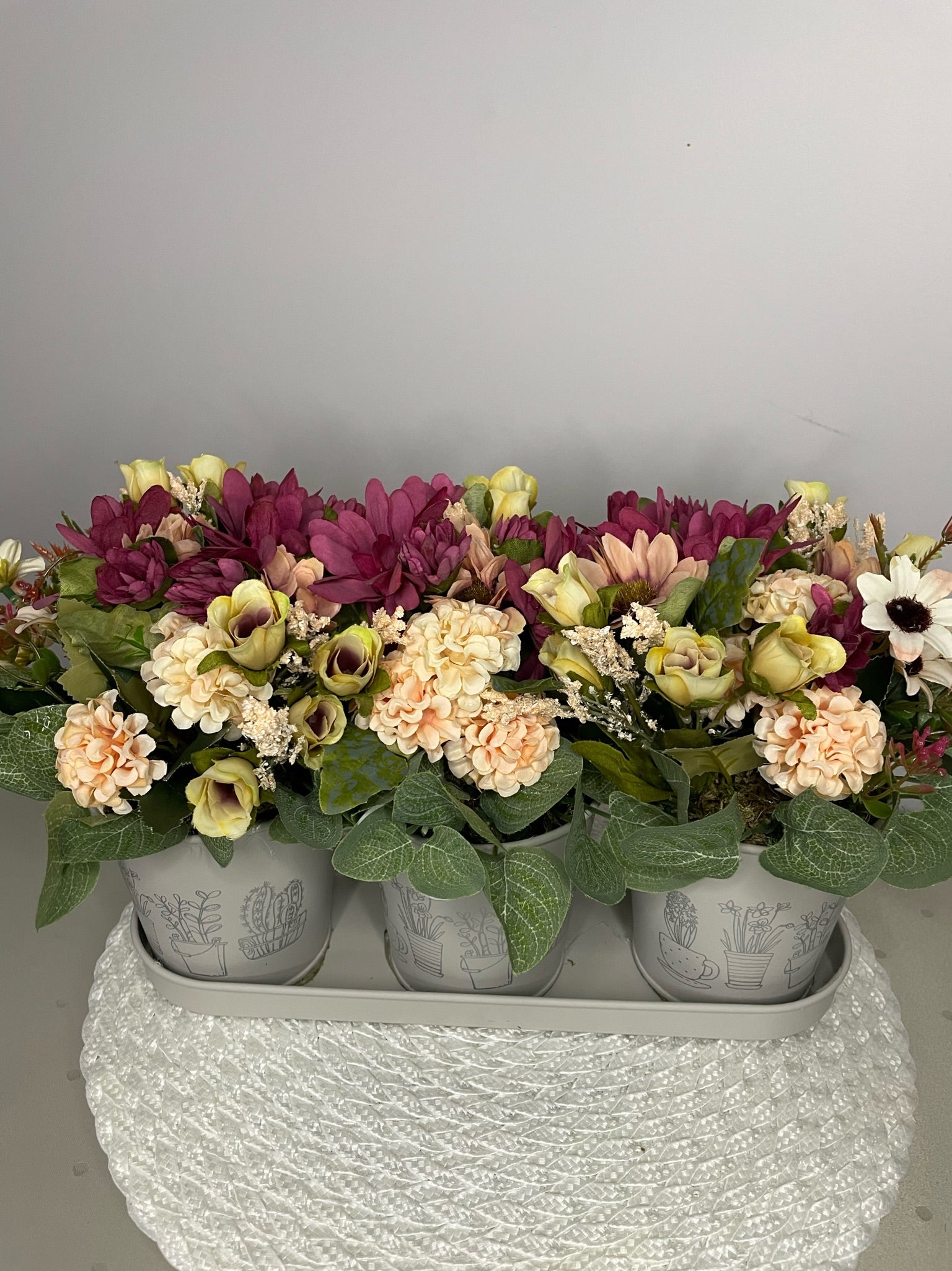 Cette ensemble de 3 vases en métal dans un plateau contenant une belle arrangement de fleurs artificiel charmera un petit coin de votre maison ou celle d'une personne qui vous est cher !