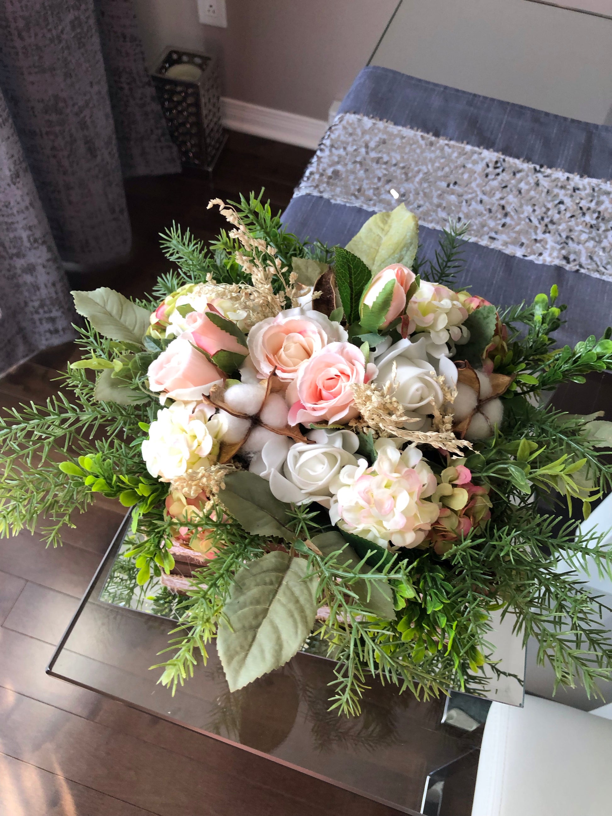 - ( Roses, fleurs de cotton, hydrangea et verdure )