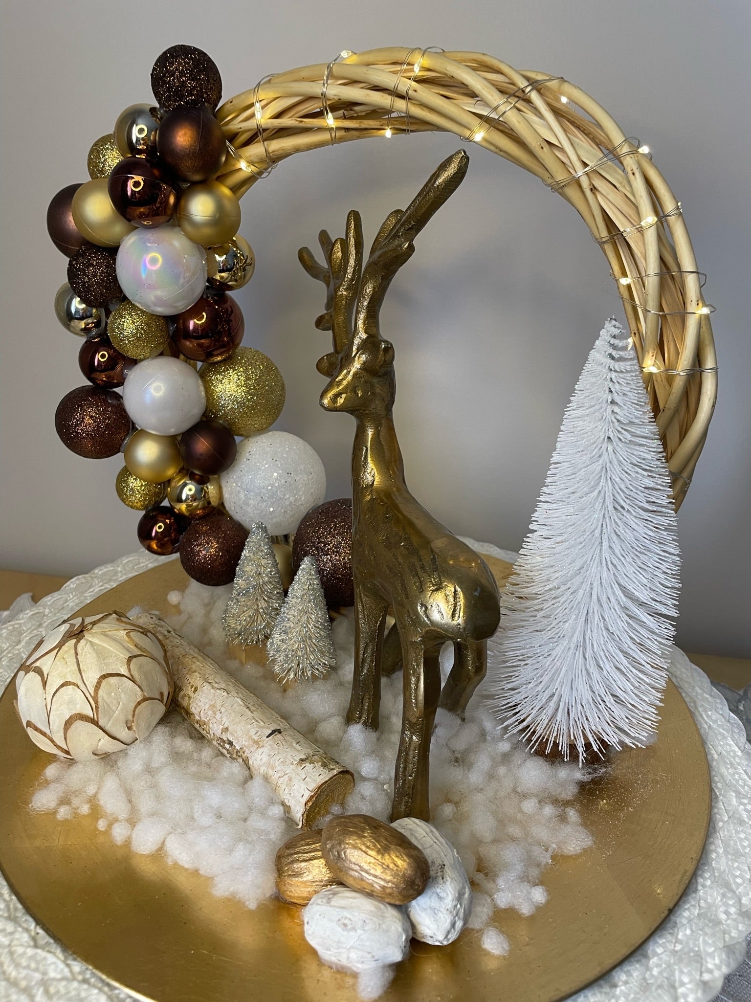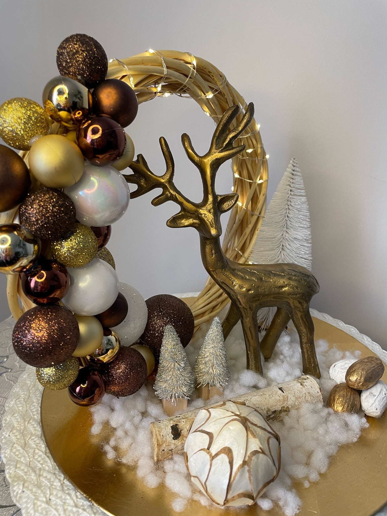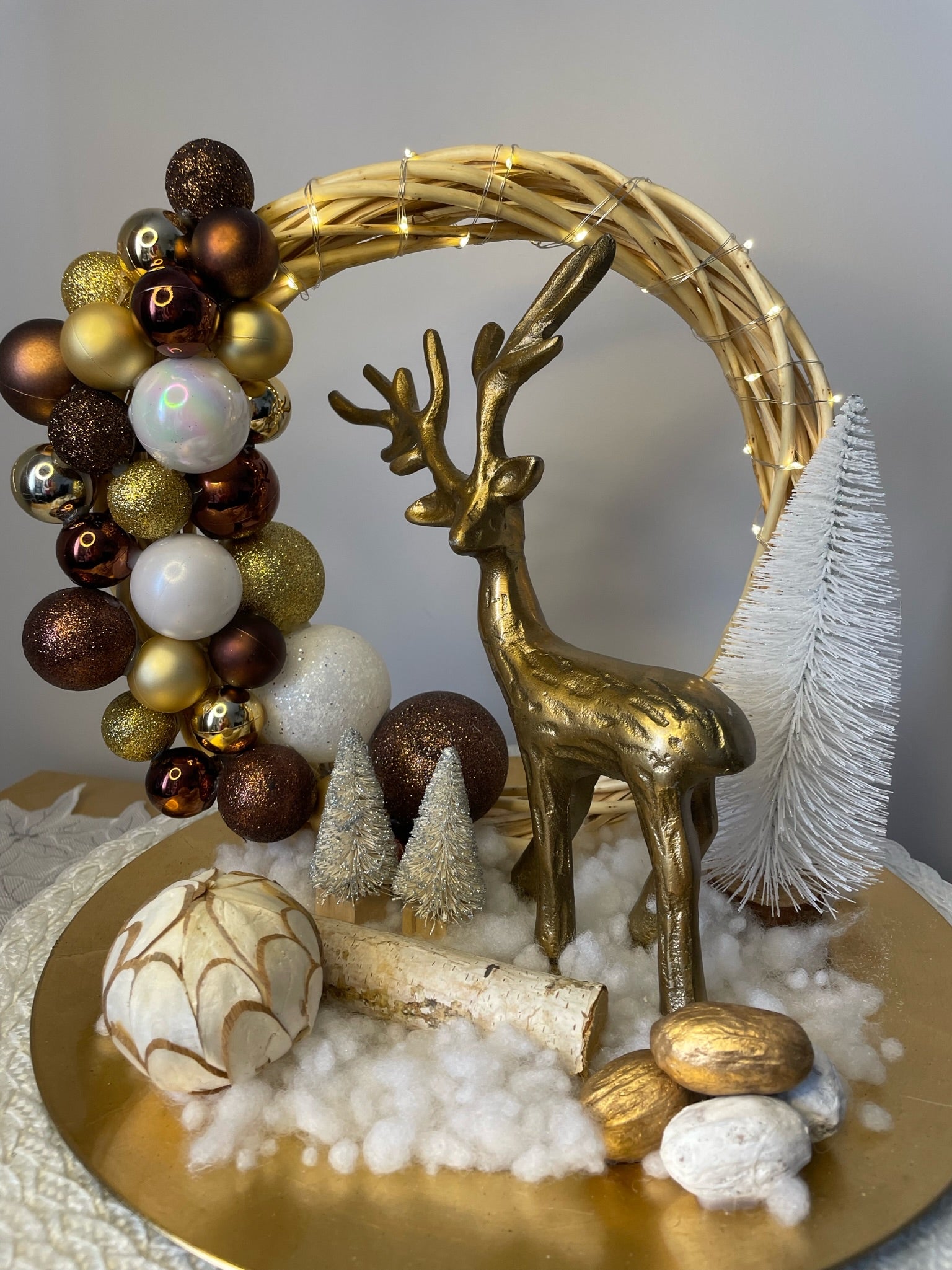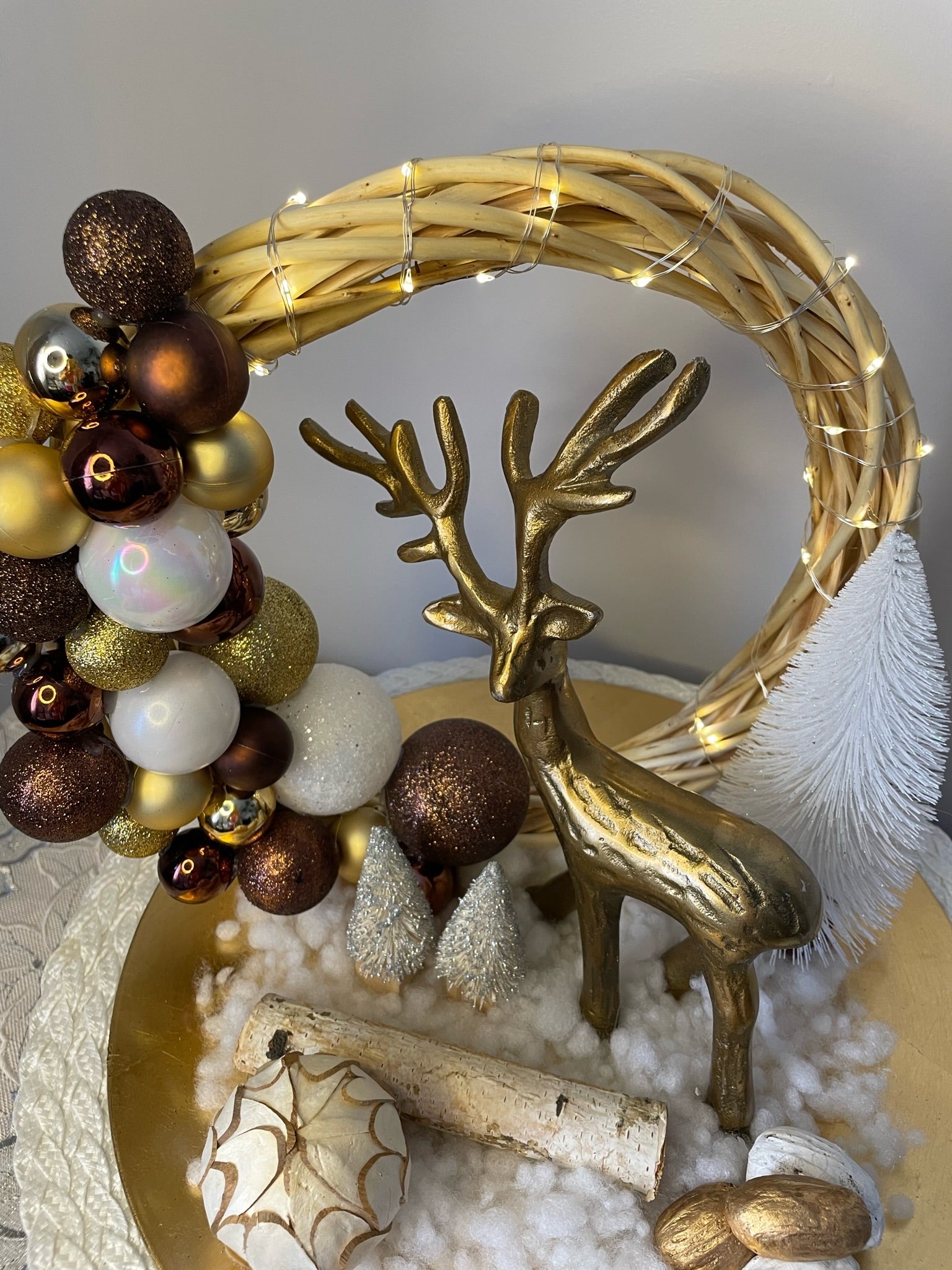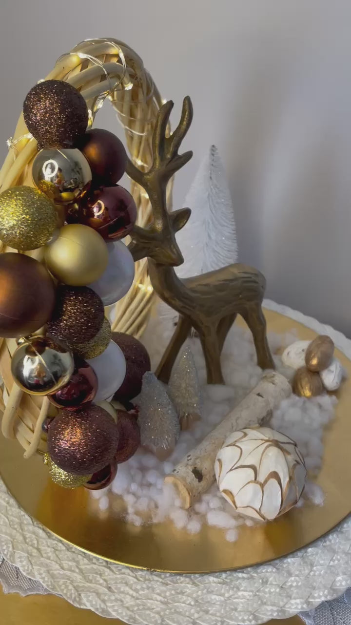 Le Centre de table "Au pays du cerf" est la pièce maîtresse de toute décoration de Noël. Avec son plateau doré, sa buche en bois et sont cerf en métal bronze raffiné, ce centre de table va illuminer la pièce avec son sapin blanc, ses boules de Noël et sa neige scintillante. La lumière LED douce crée une ambiance intime et soignée.