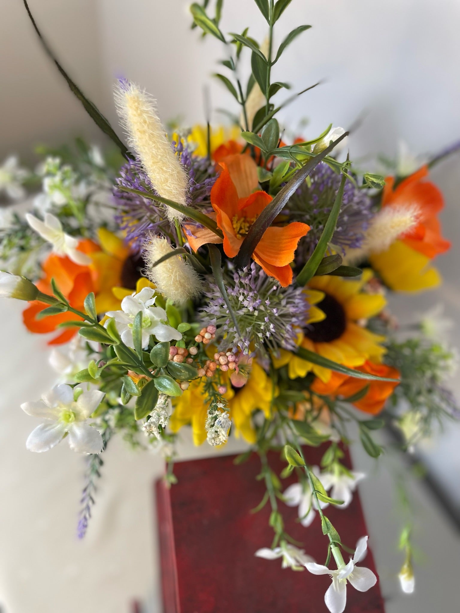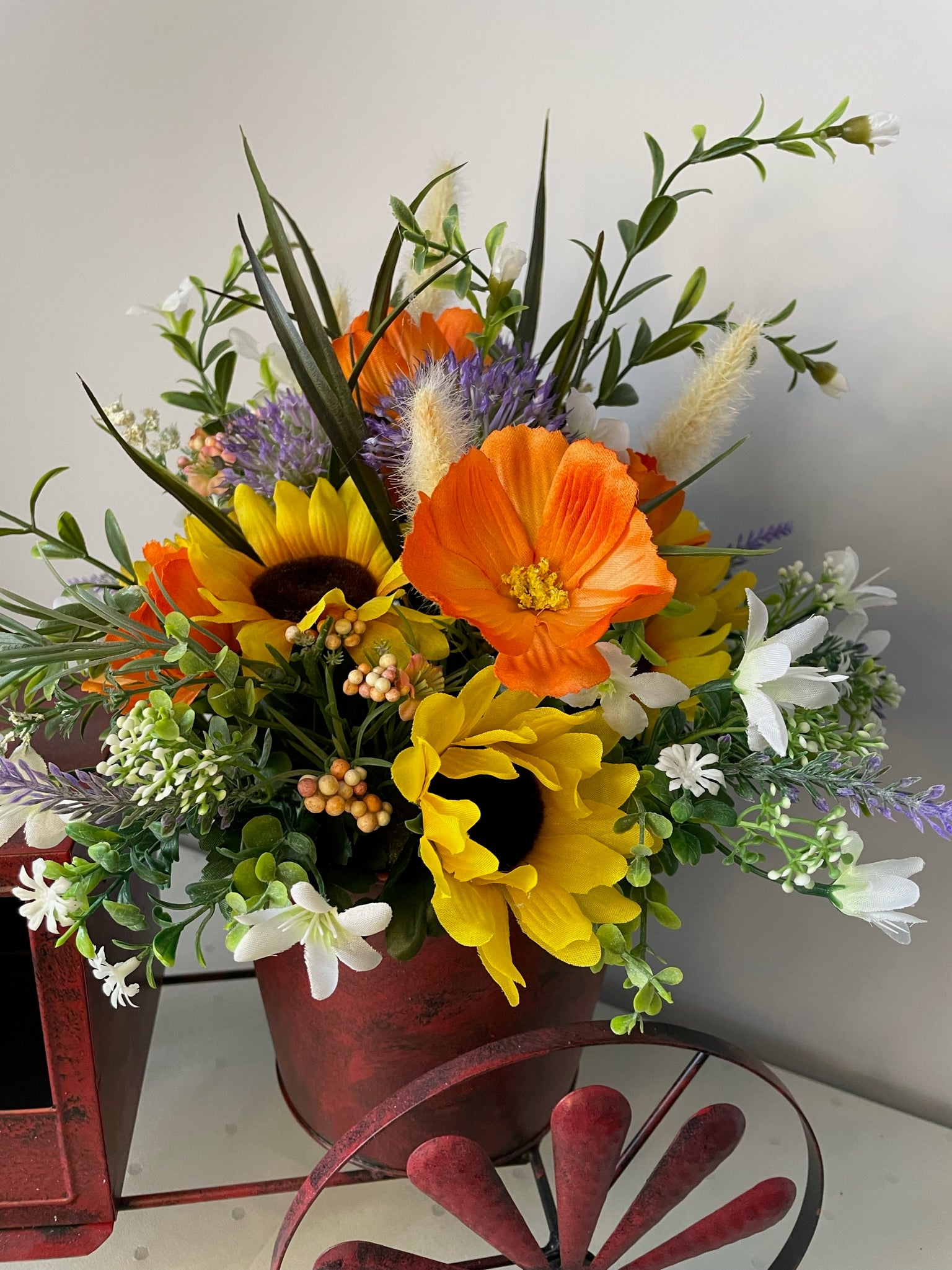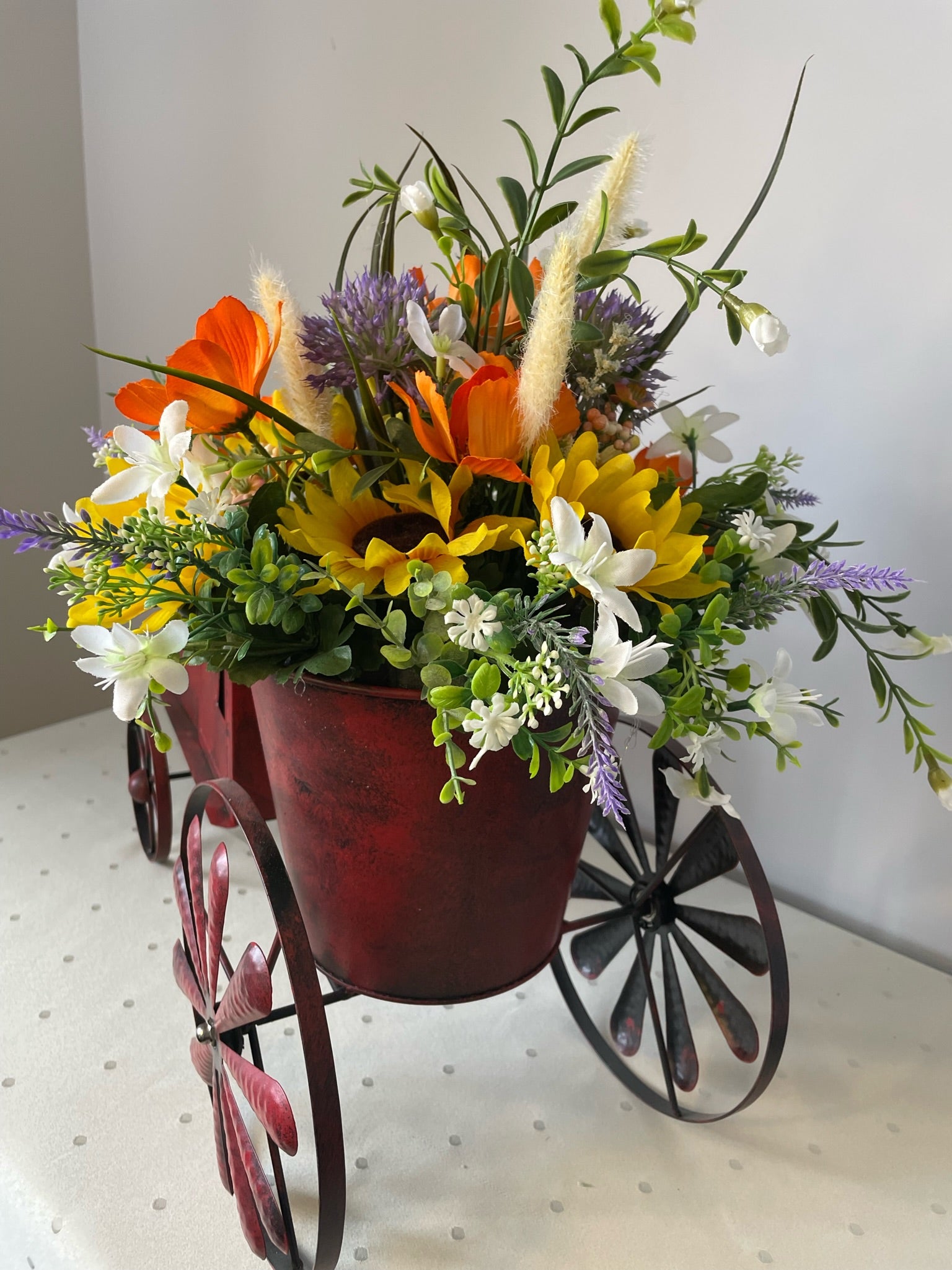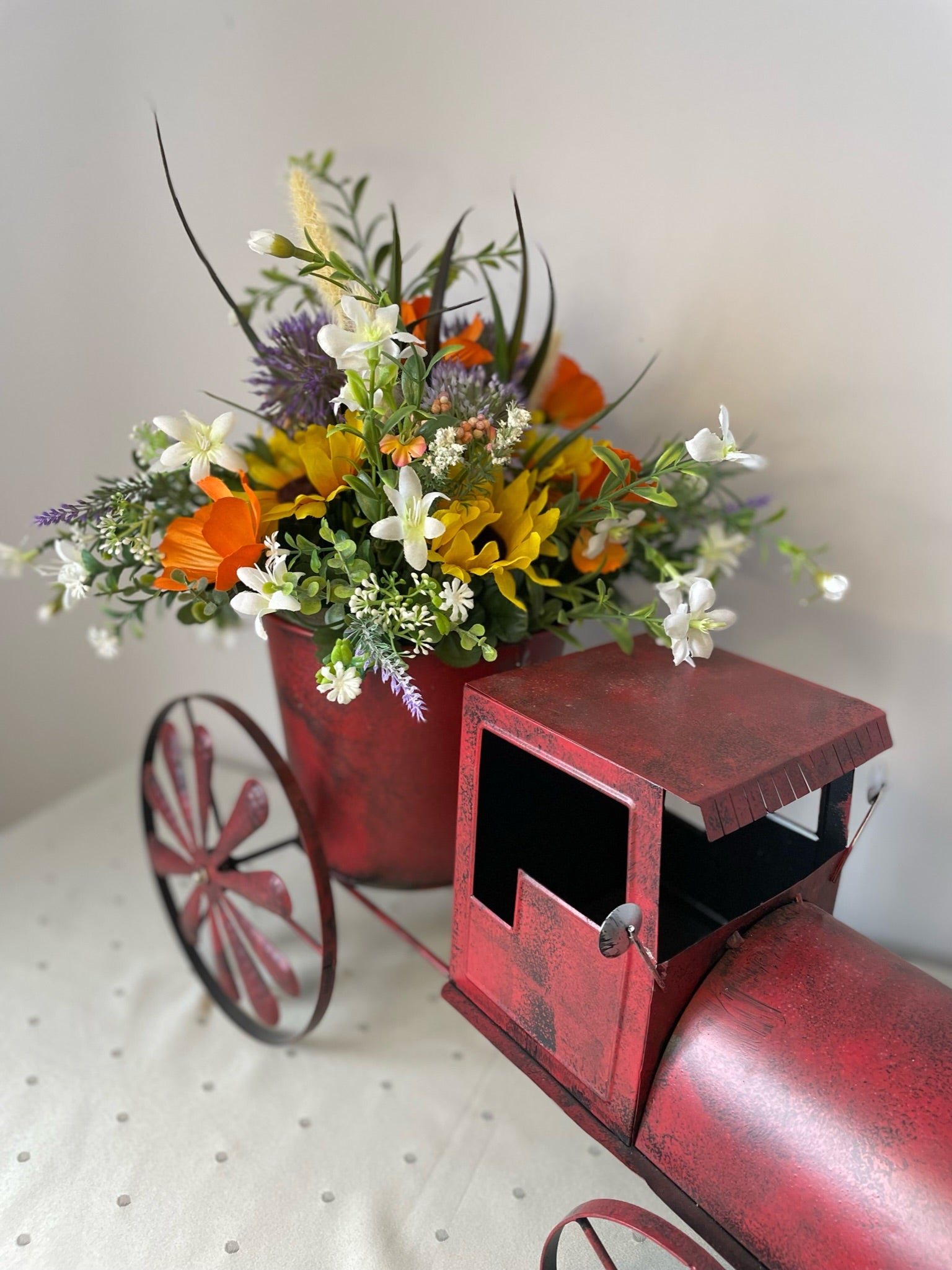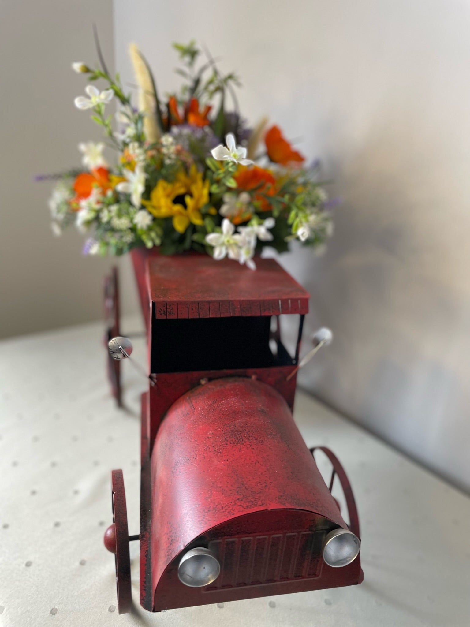 Voiture ancienne rouge en métal avec pot à fleurs décoré d'un assortiment de fleurs de printemps sera charmé un coin de votre maison ou celle d'une personne qui vous est cher !