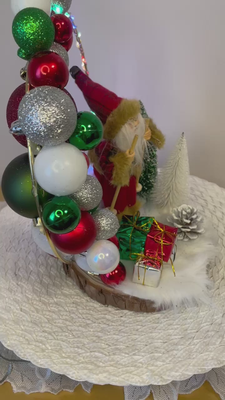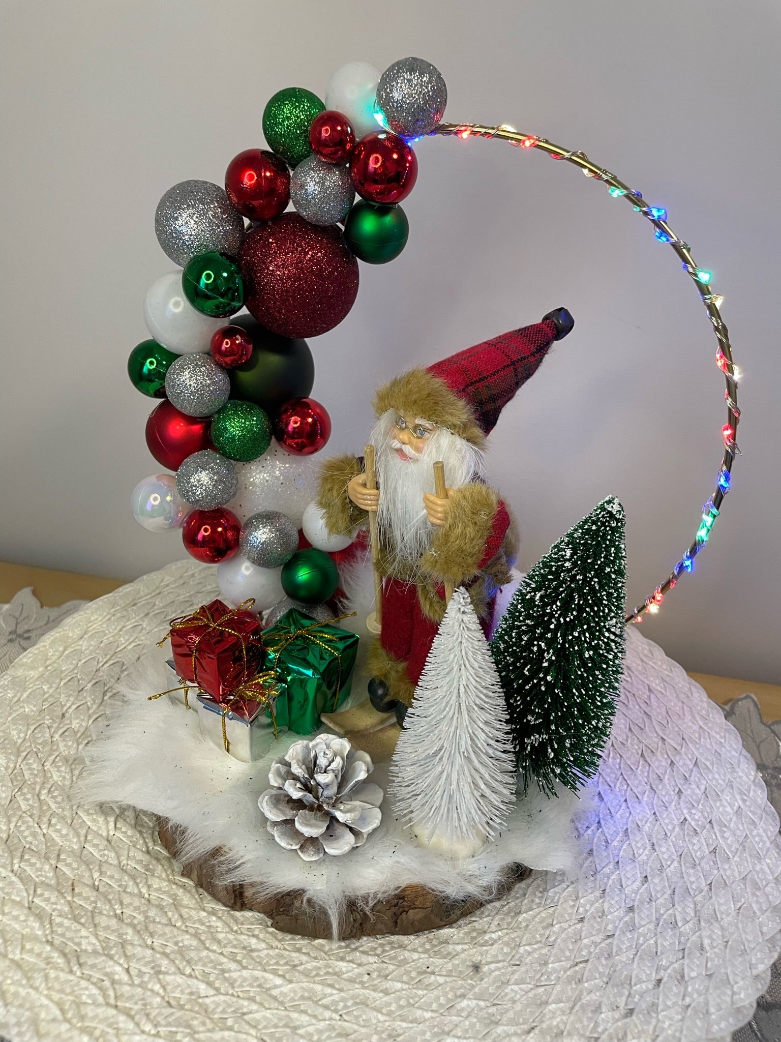 Ce centre de table "Le royaume du père noel" est composé de cadeaux, de boules de noel et de sapins, ornés de couleurs rouge, blanc, vert et argentée. La lumière LED offre une atmosphère intime et féerique et le père noel lui-même complète l'ambiance.