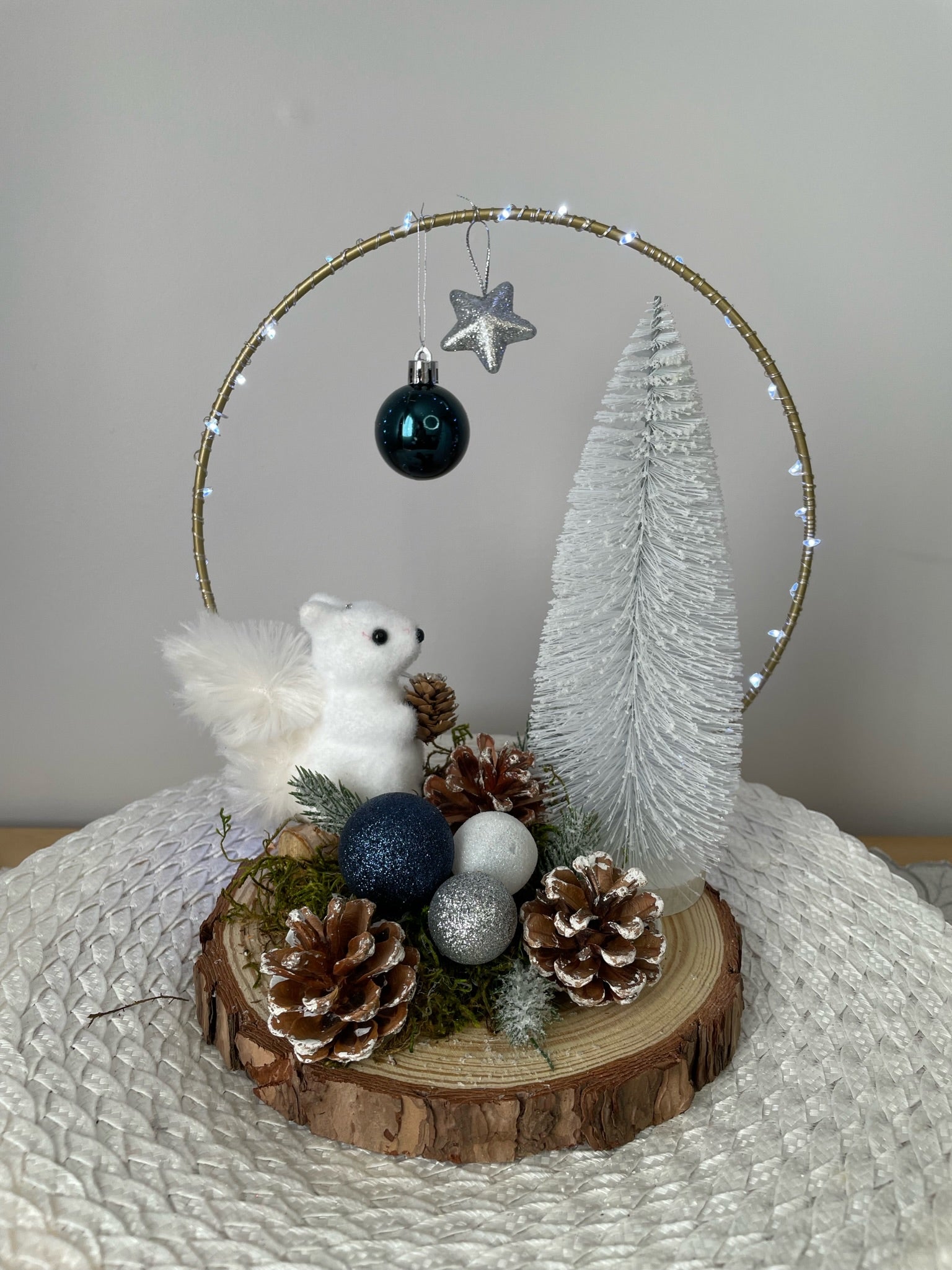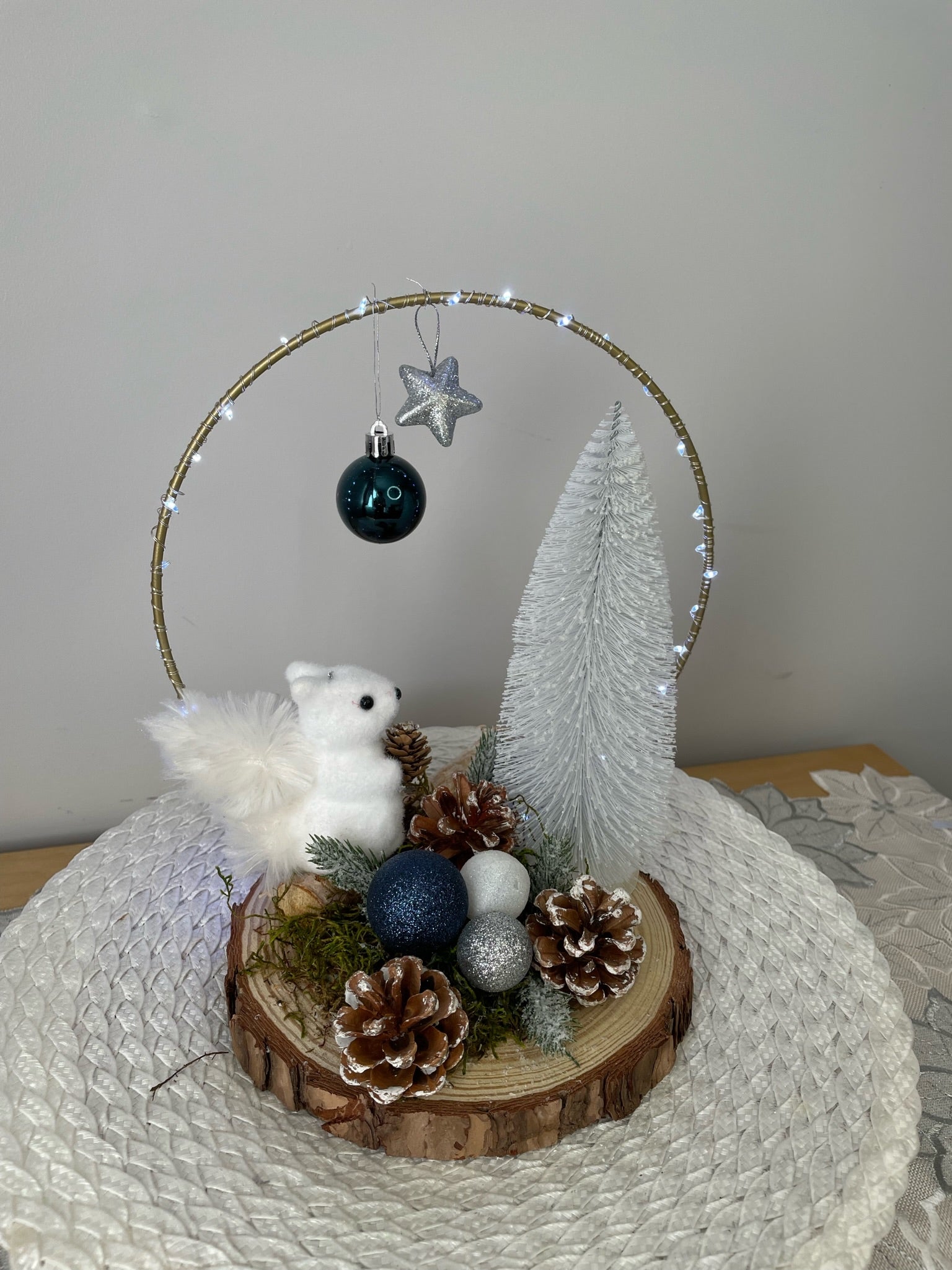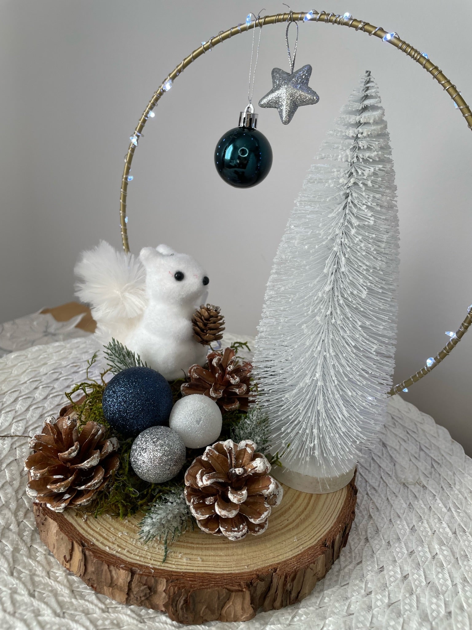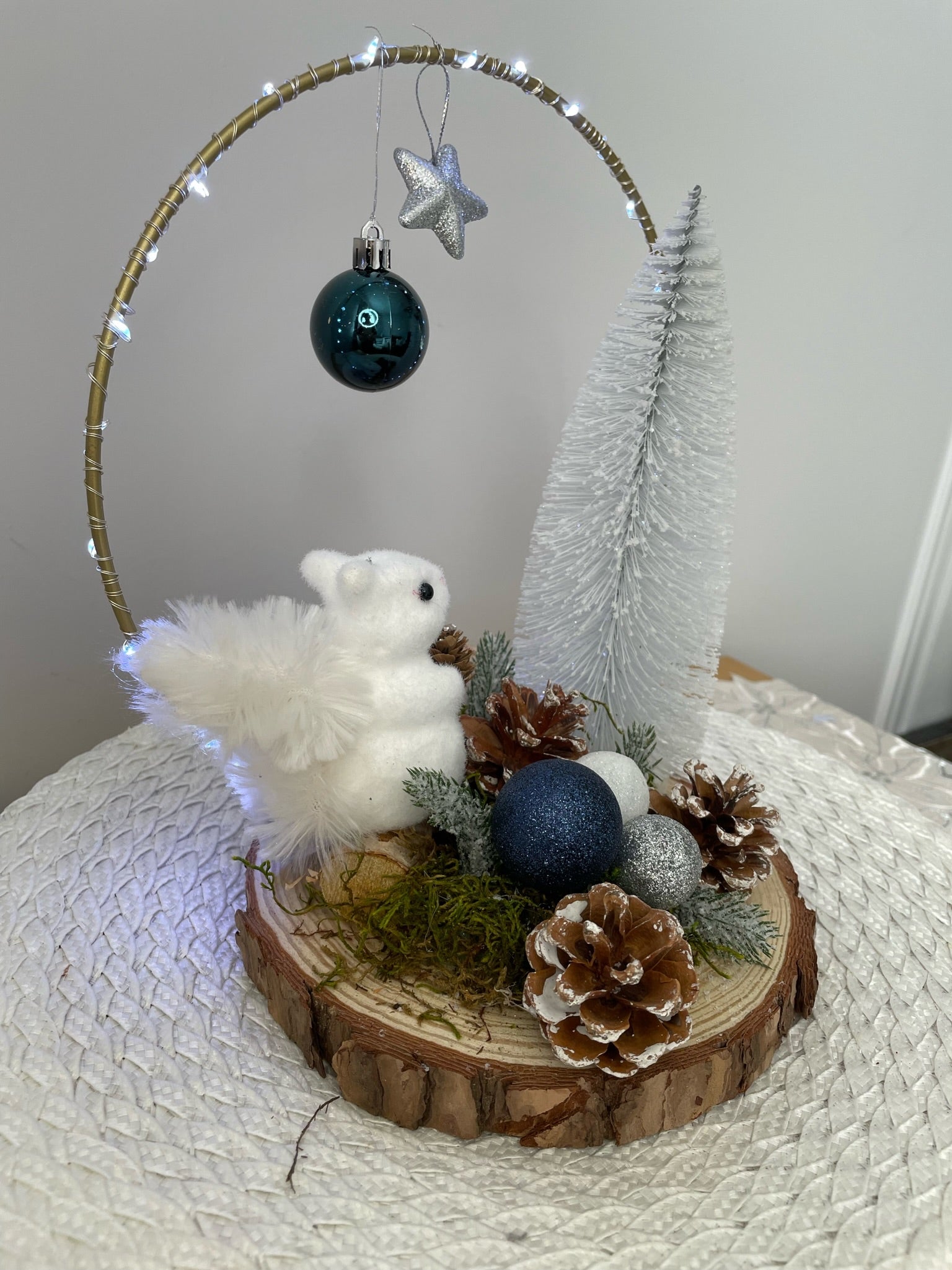 Tous les éléments de ce magnifique centre de table " L'Écureuil " sont parfaitement harmonieux et rendront votre décor de Noël unique: le sapin blanc, la tranche de buche de bois et les Cocottes de pins sont illuminés par des lumières LED qui donnera une touche magique à la pièce. Noël ne sera plus jamais le même!
