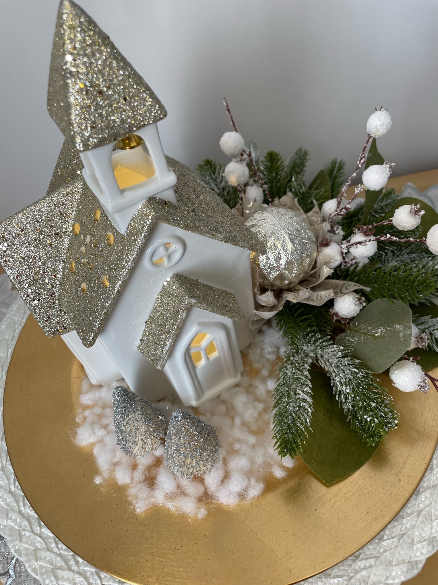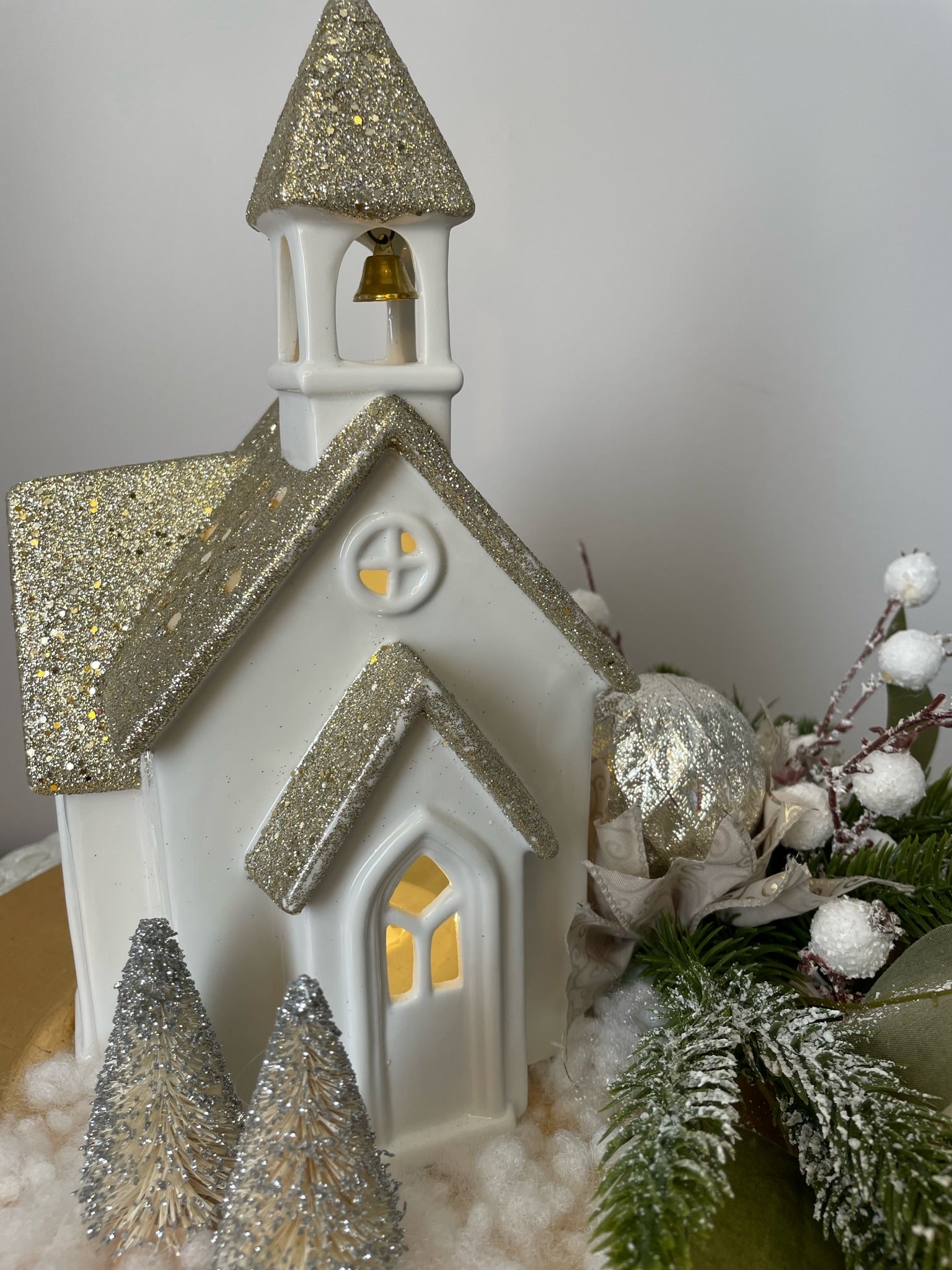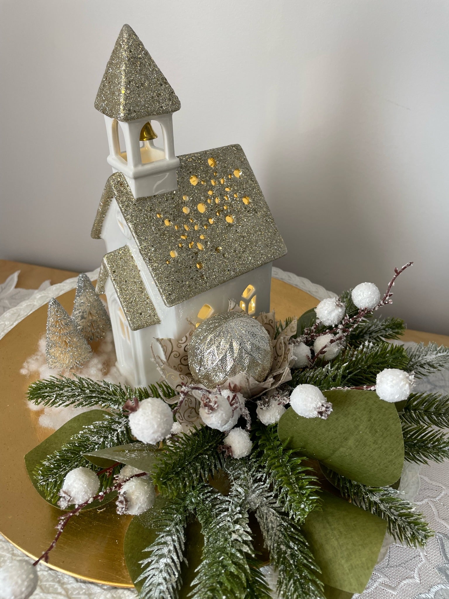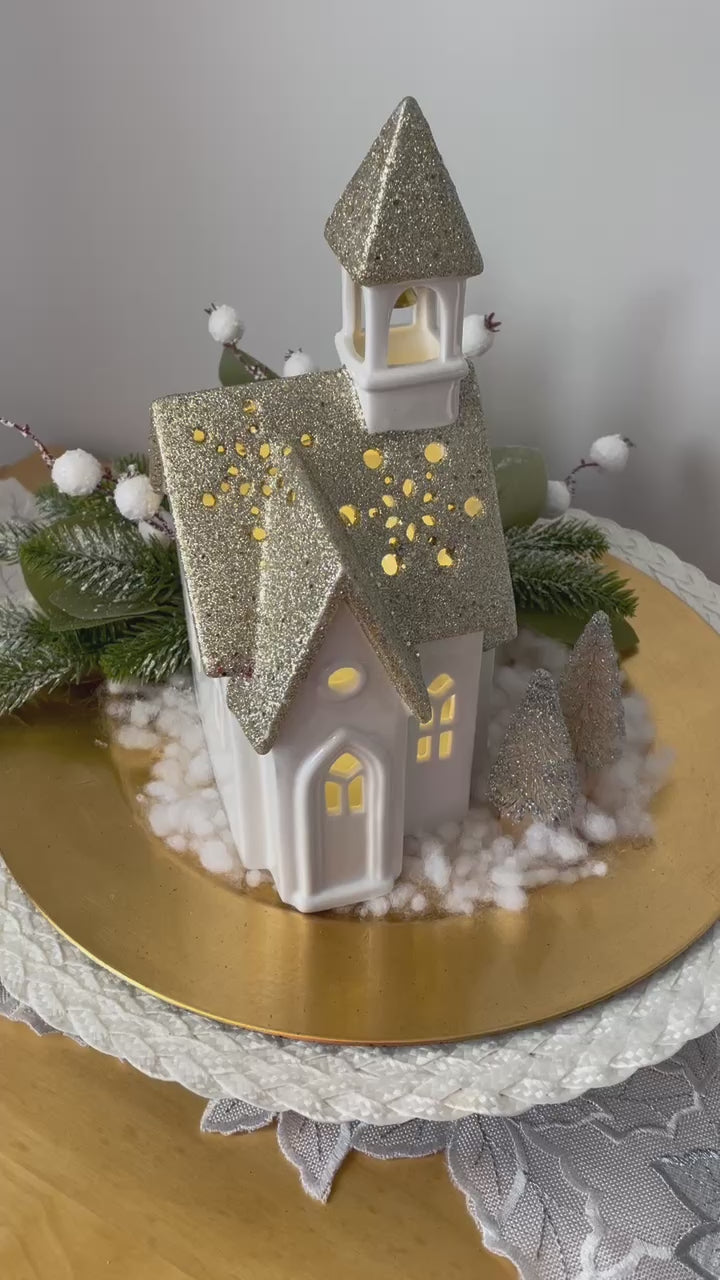 Notre centre de table "L'Église" exquis est composé d'un plateau doré, de pins vert et d'une église en céramique avec une lumière intégrée. Transformez votre intérieur avec ce chef-d'œuvre décoratif unique.