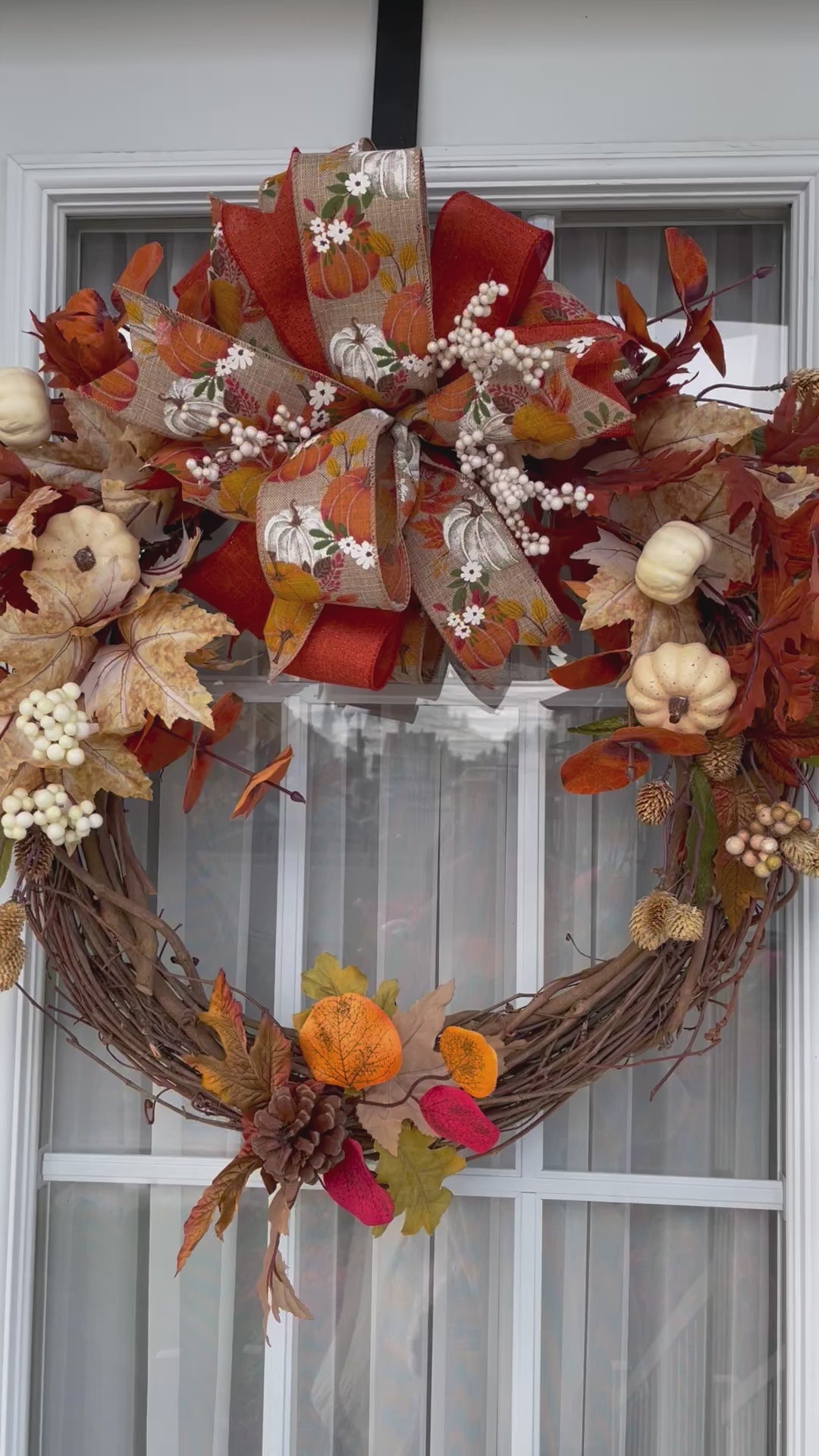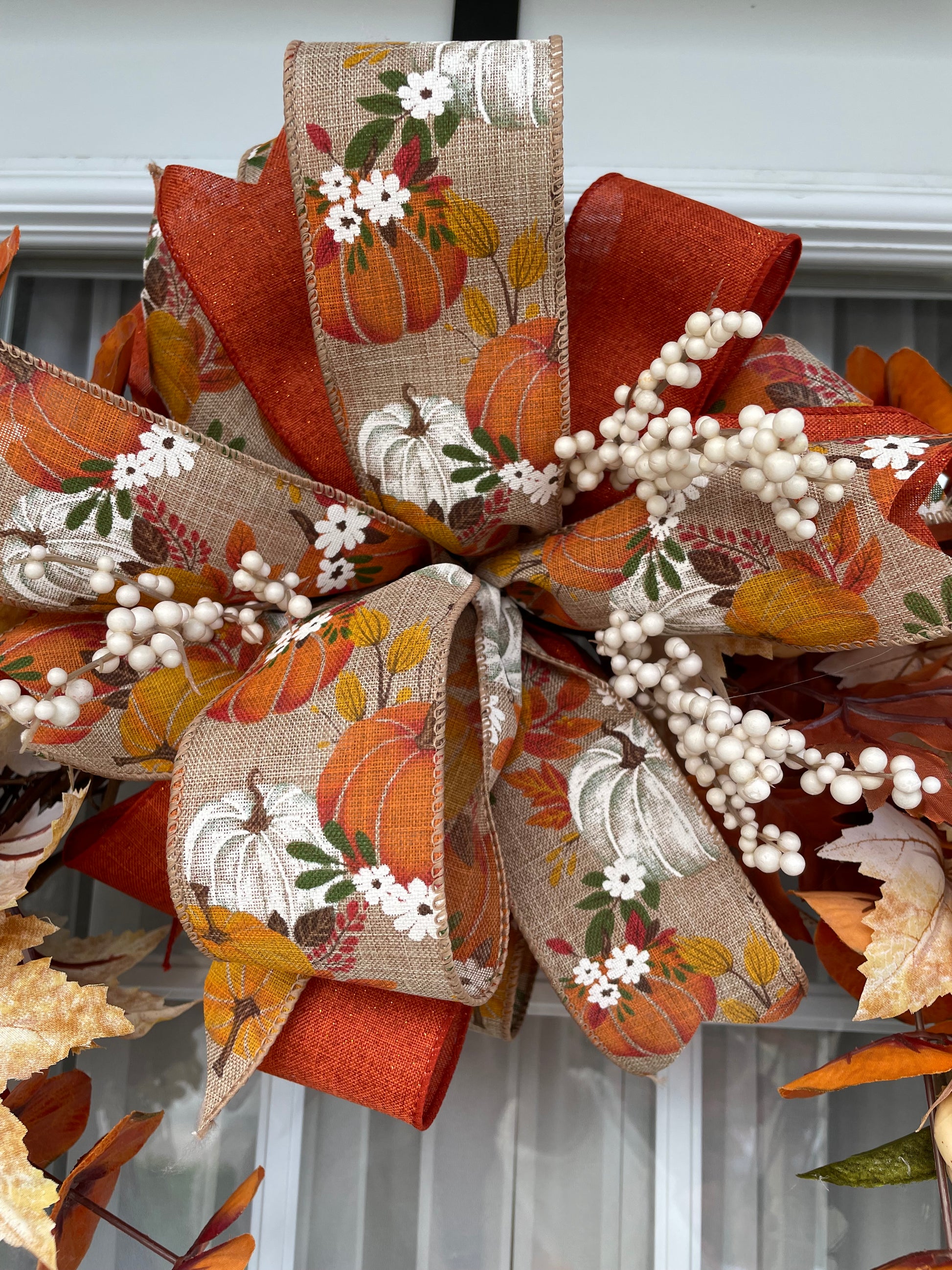 Couronne de fleurs 24 pouces fait a la main avec matériaux neufs sur couronne de vigne naturelle avec feuillage d'automne, citrouilles et boucle.