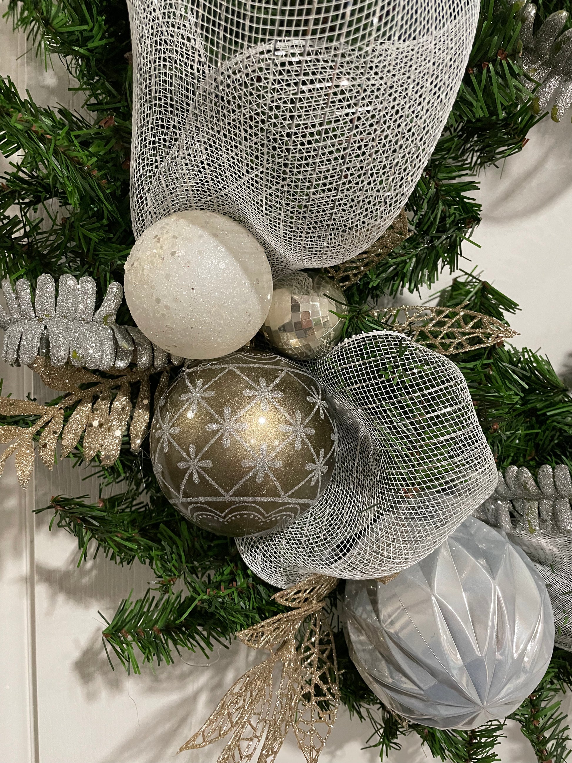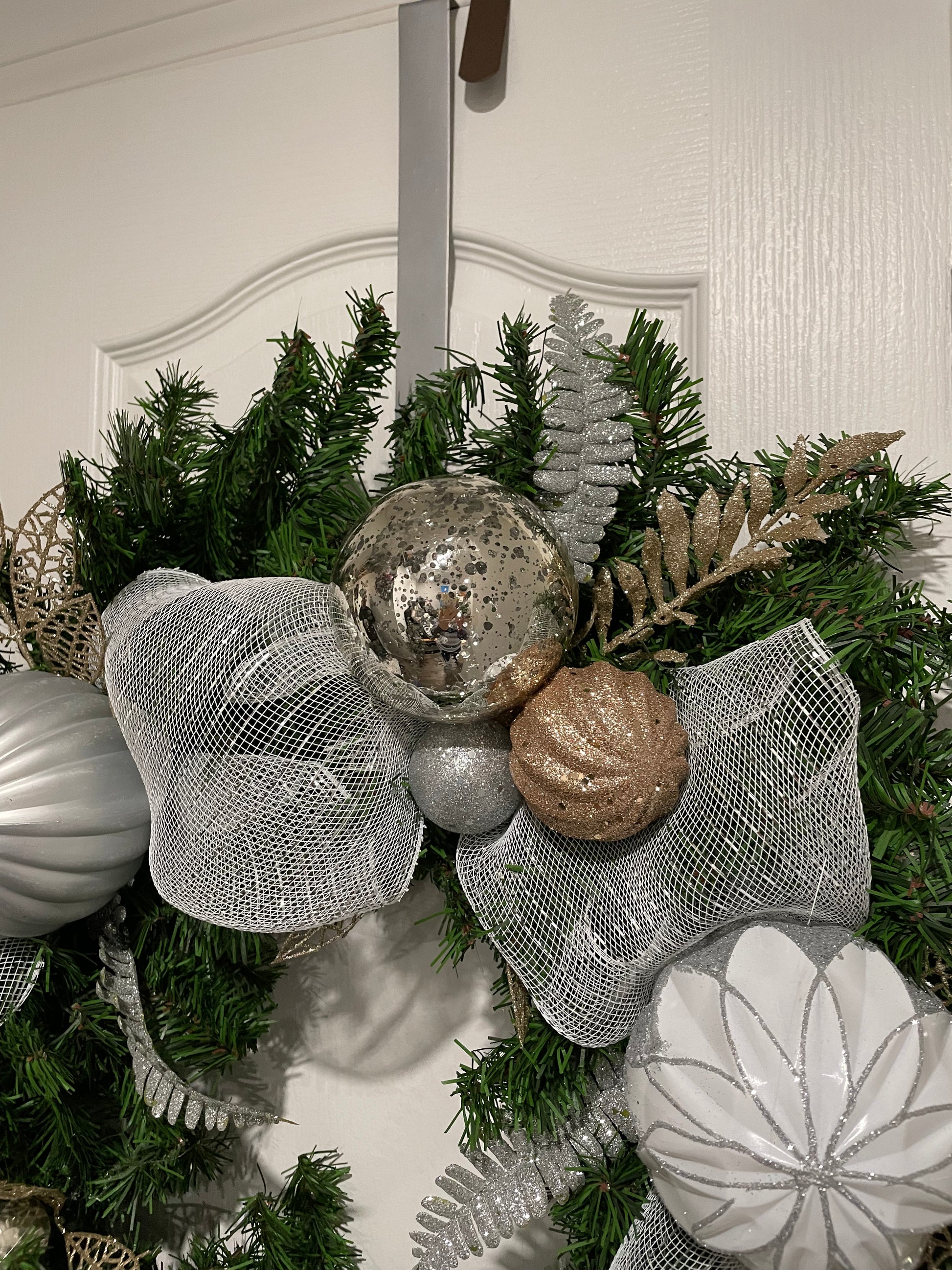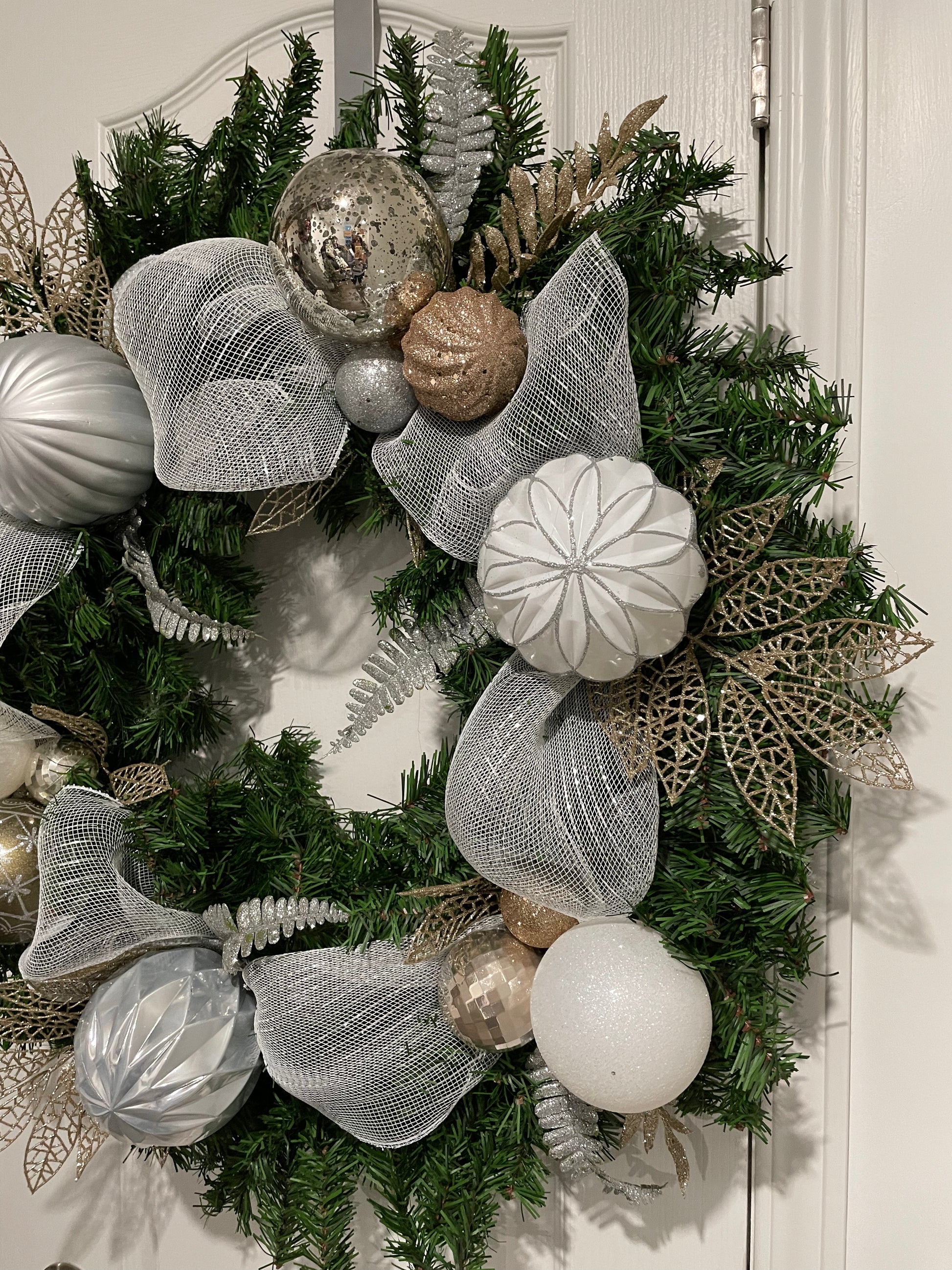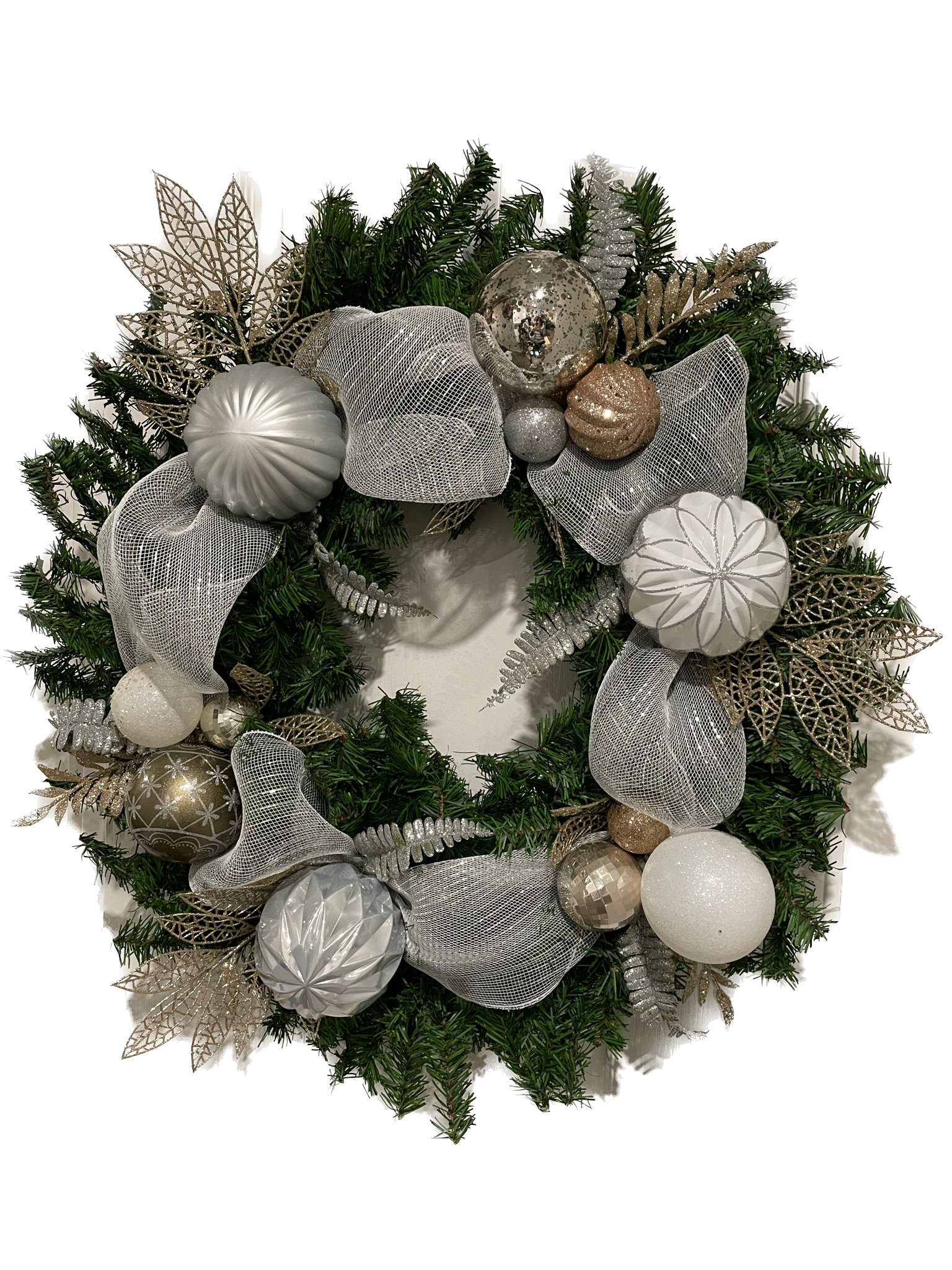 Couronne de NOËL 30 pouces fait a la main avec matériaux neufs sur couronne de sapin artificiel avec ses ornements.