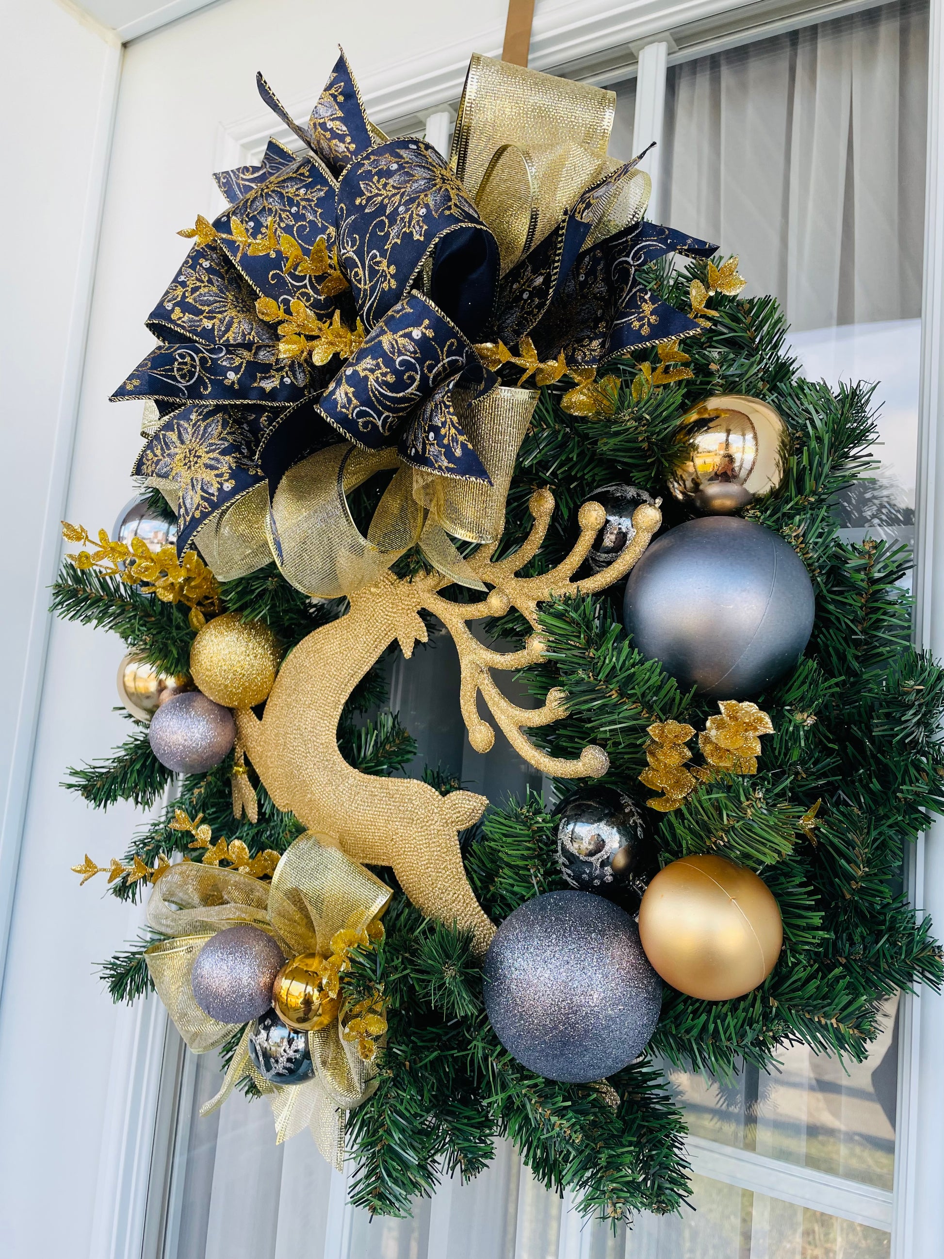 Couronne de NOËL 24 pouces fait a la main avec matériaux neufs, sur couronne de sapin artificiel avec cerf de couleur Or.