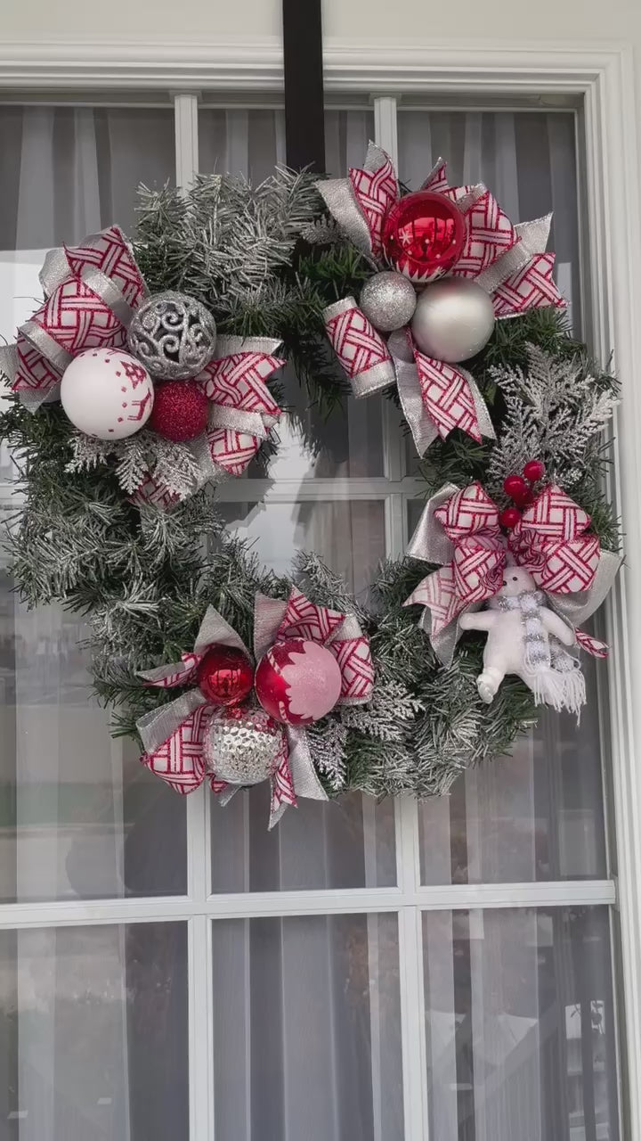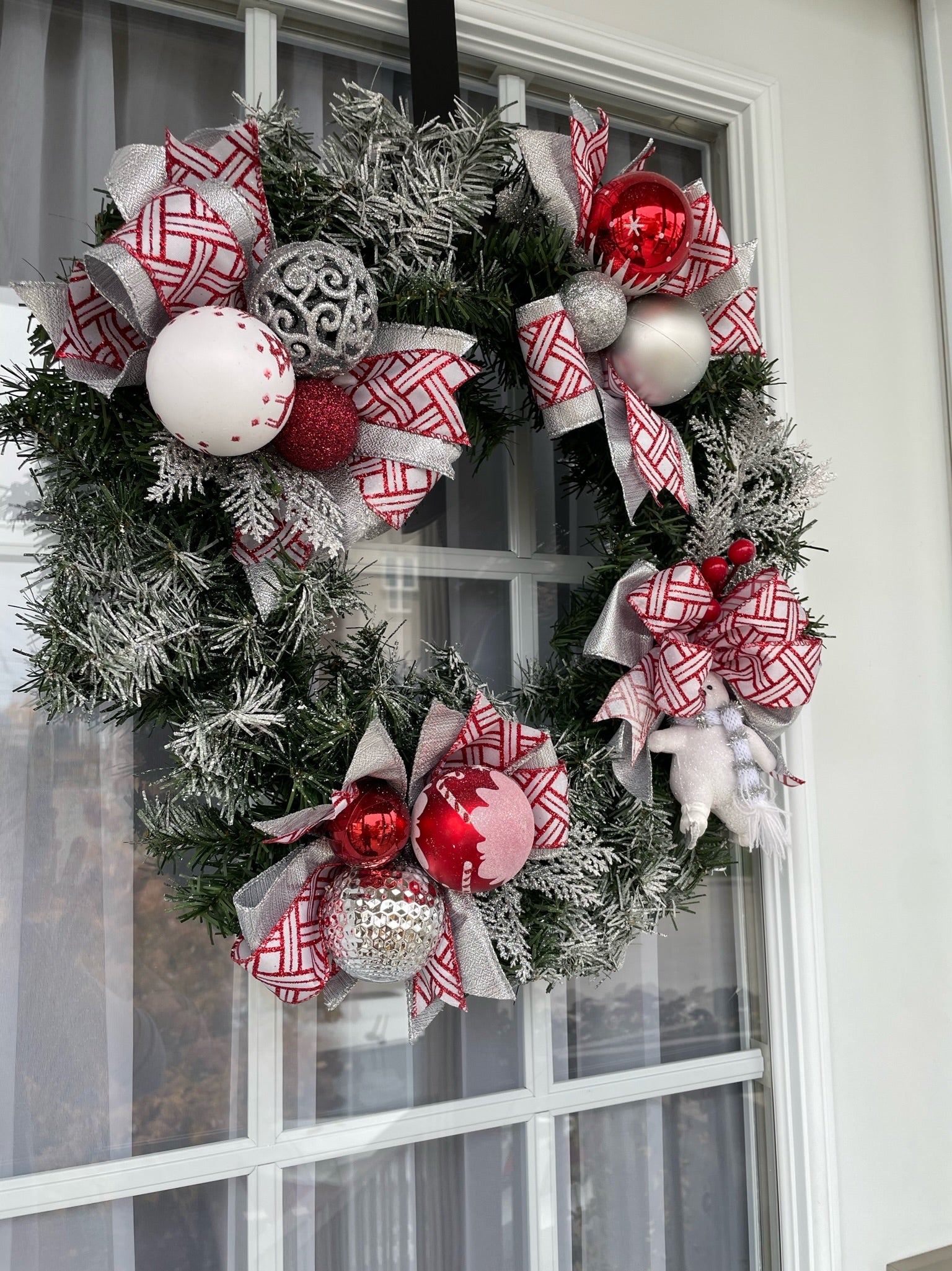 Couronne de NOËL 20 pouces fait a la main avec matériaux neufs sur couronne de sapin artificiel avec ses ornements.