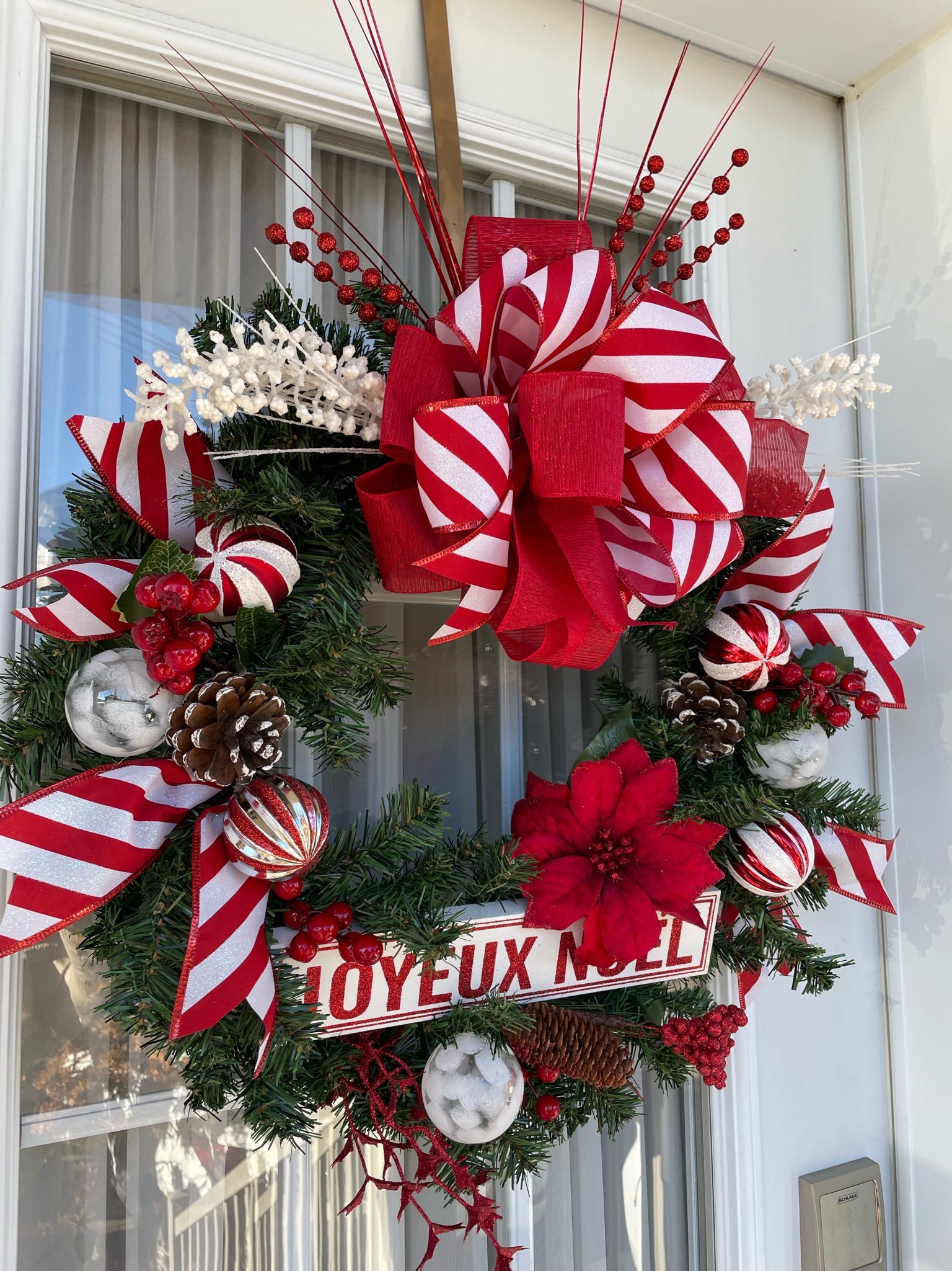 Couronne de NOËL 24 pouces fait a la main avec matériaux neufs sur couronne de sapin artificiel.