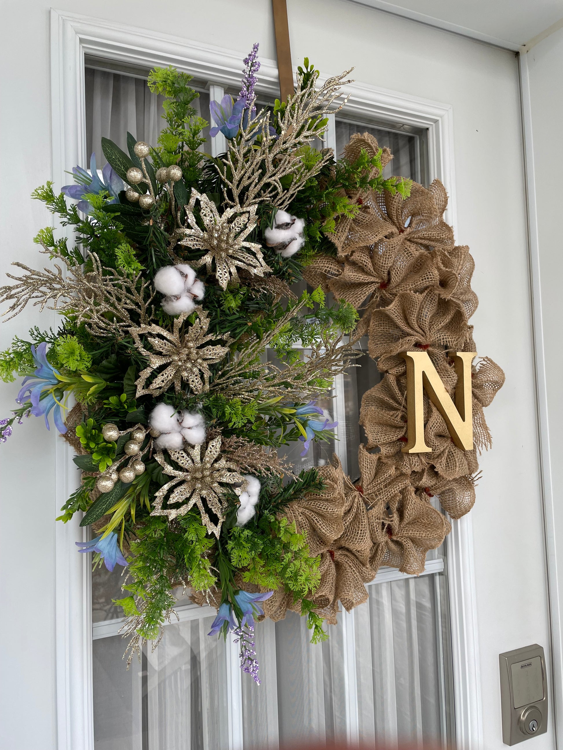 Couronne 22 pouces fait a la main avec matériaux neufs sur couronne de jute naturelle avec " N " de couleur Or, fleurs de coton, fleurs de couleur Or, feuillage vert et autres.