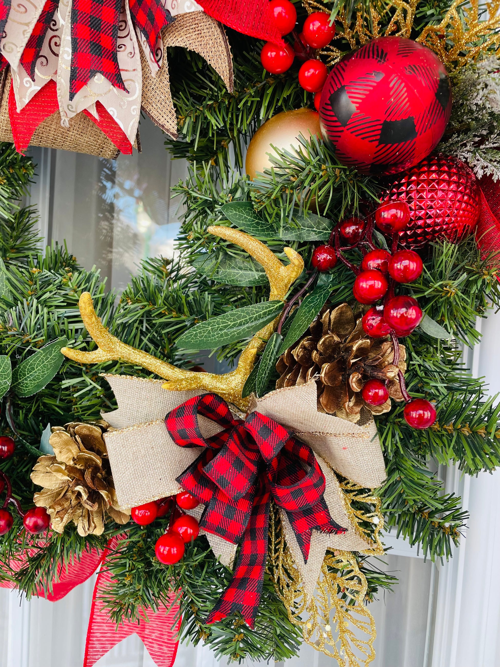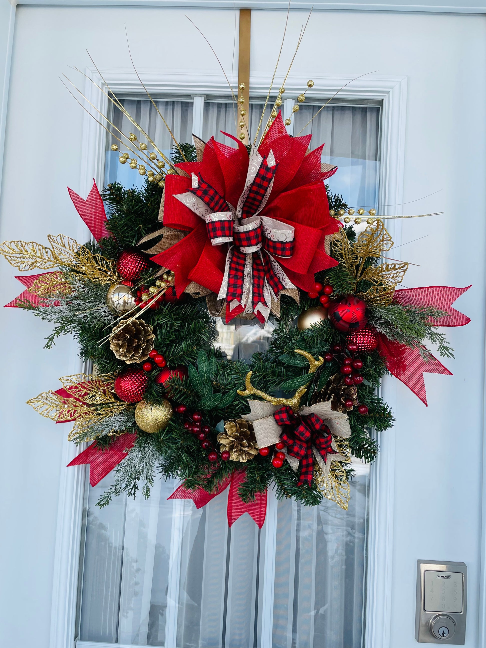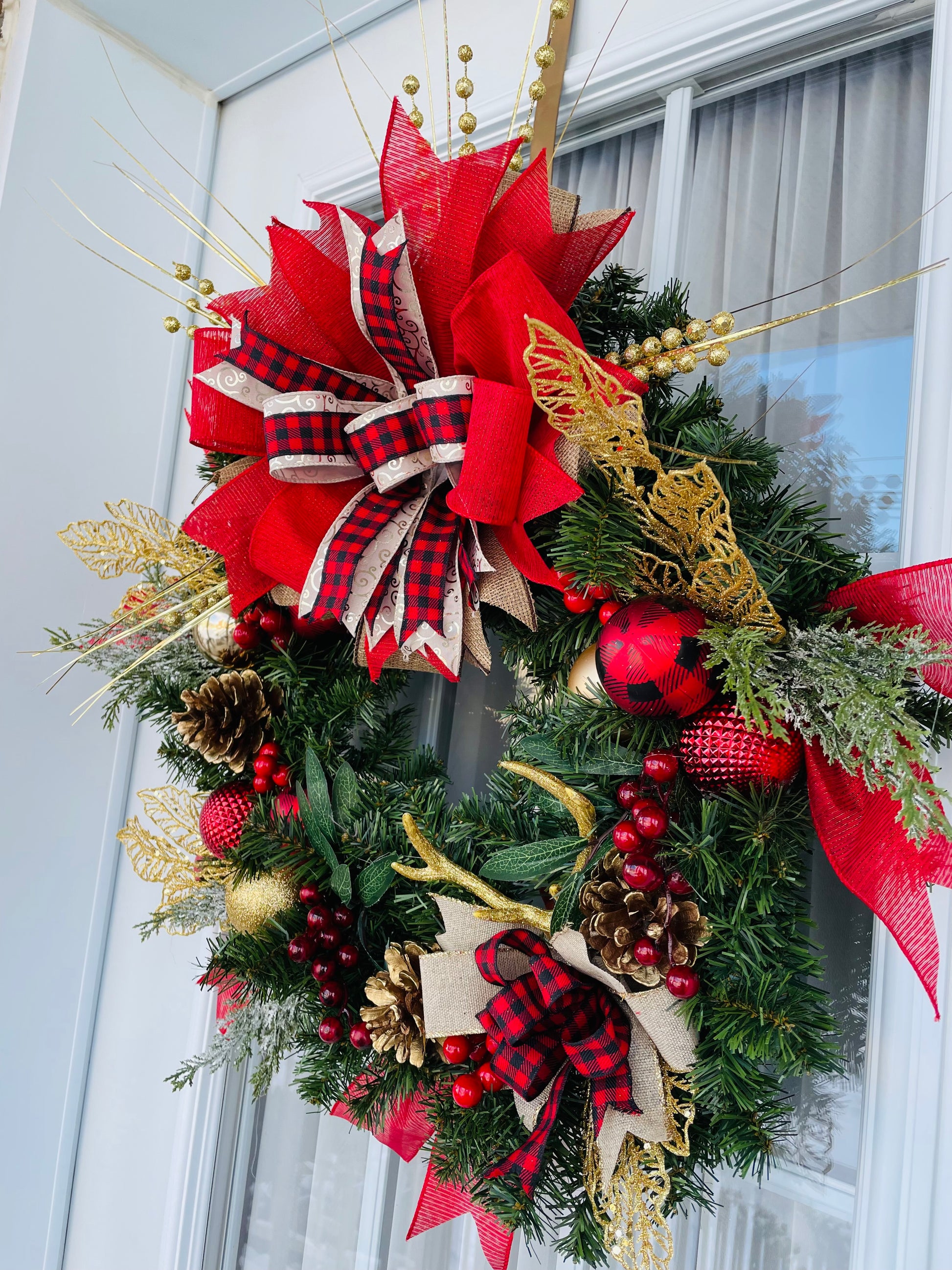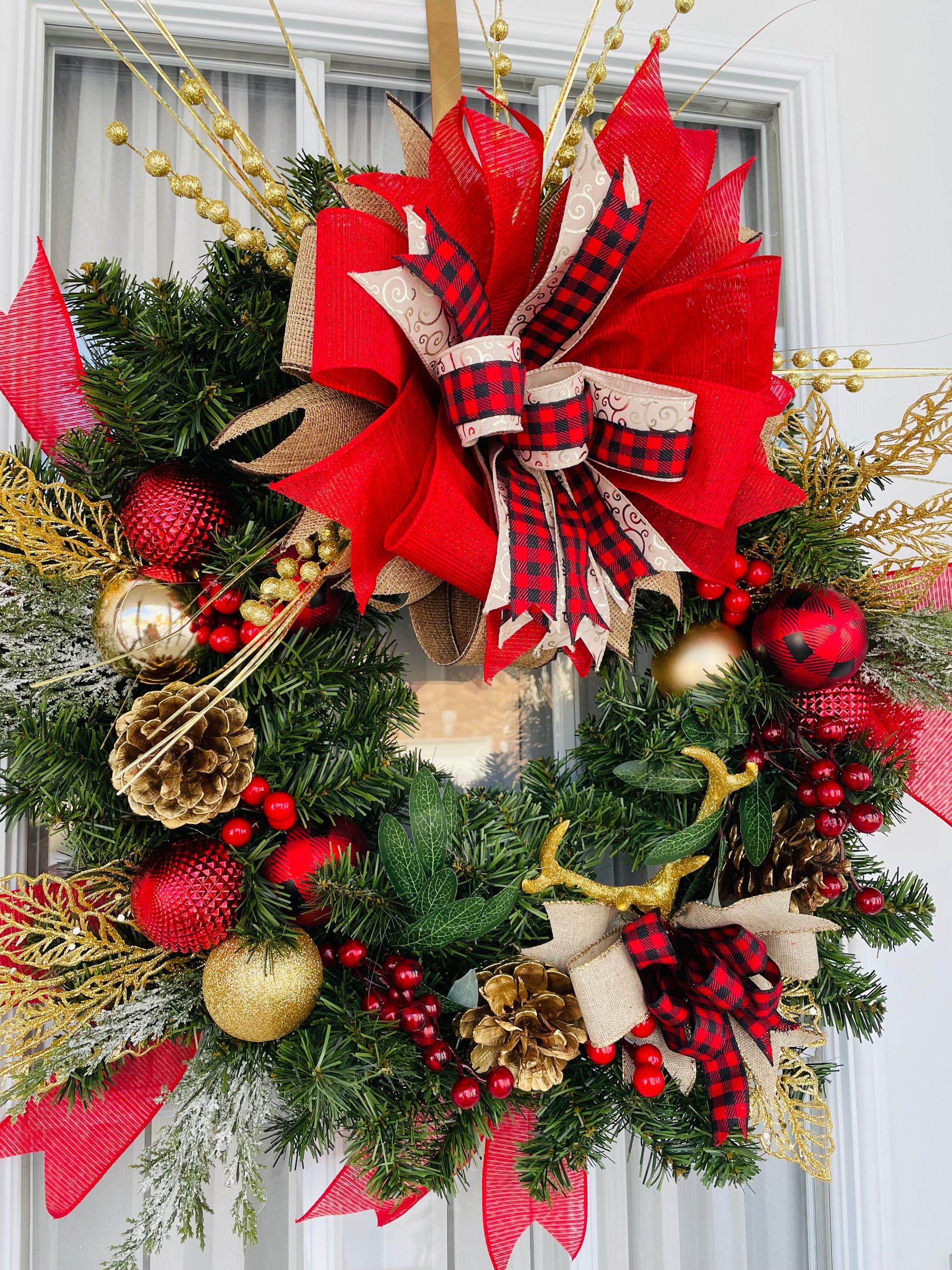 Couronne de NOËL 24 pouces fait a la main avec matériaux neufs sur couronne de sapin artificiel avec cloche.