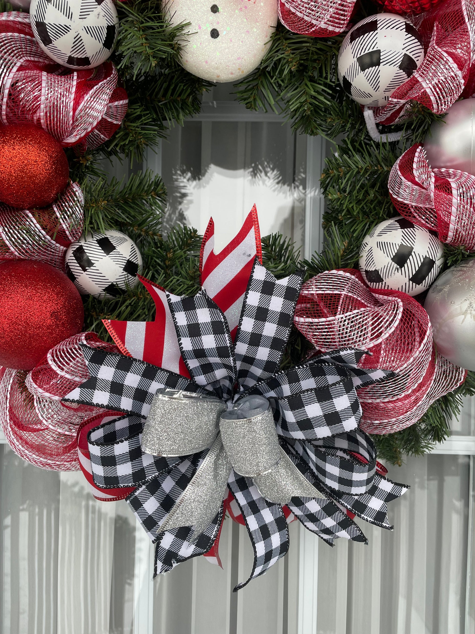 Couronne de NOËL 24 pouces fait a la main avec matériaux neufs sur couronne de sapin artificiel avec bonhomme de neige.