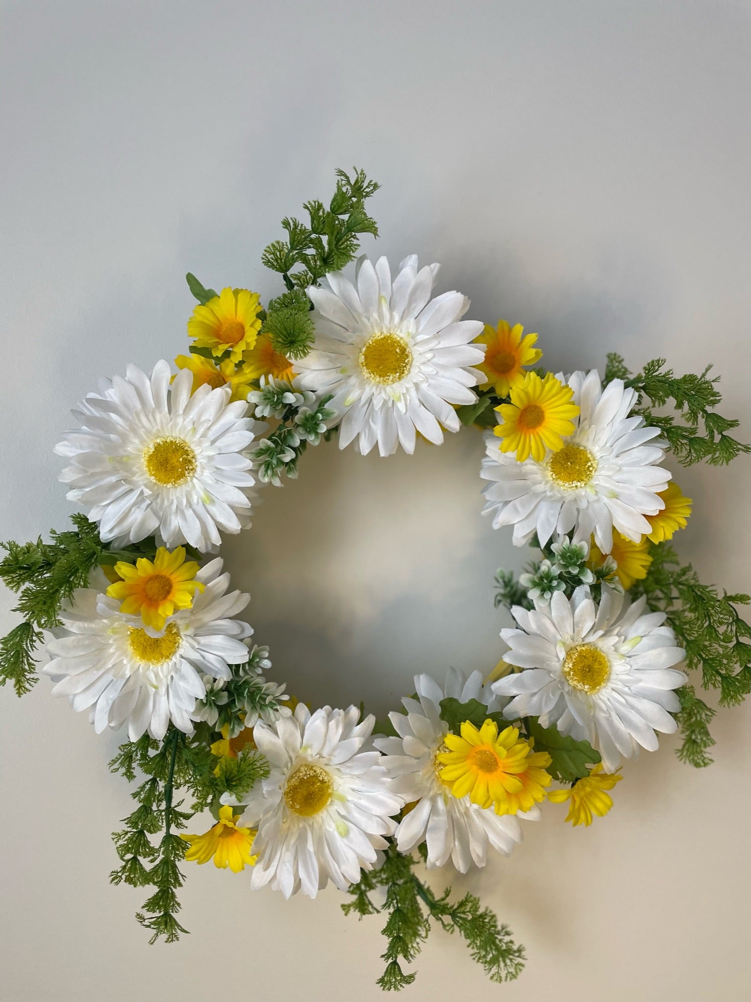 Couronne de fleurs 18 pouces fait a la main avec matériaux neufs sur couronne de vigne naturelle.