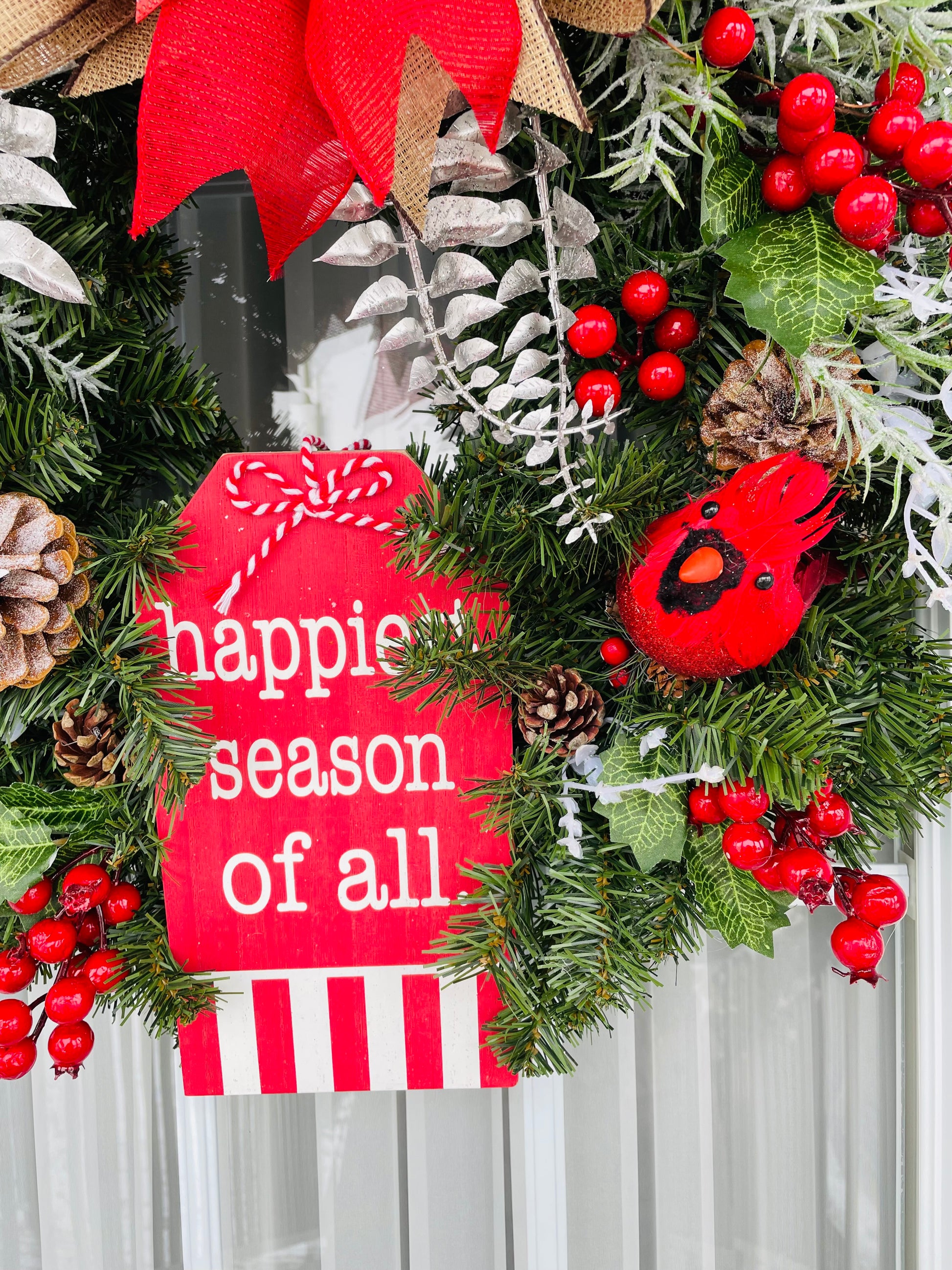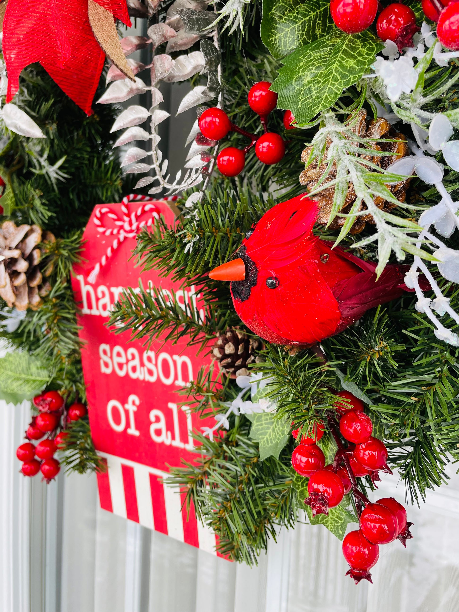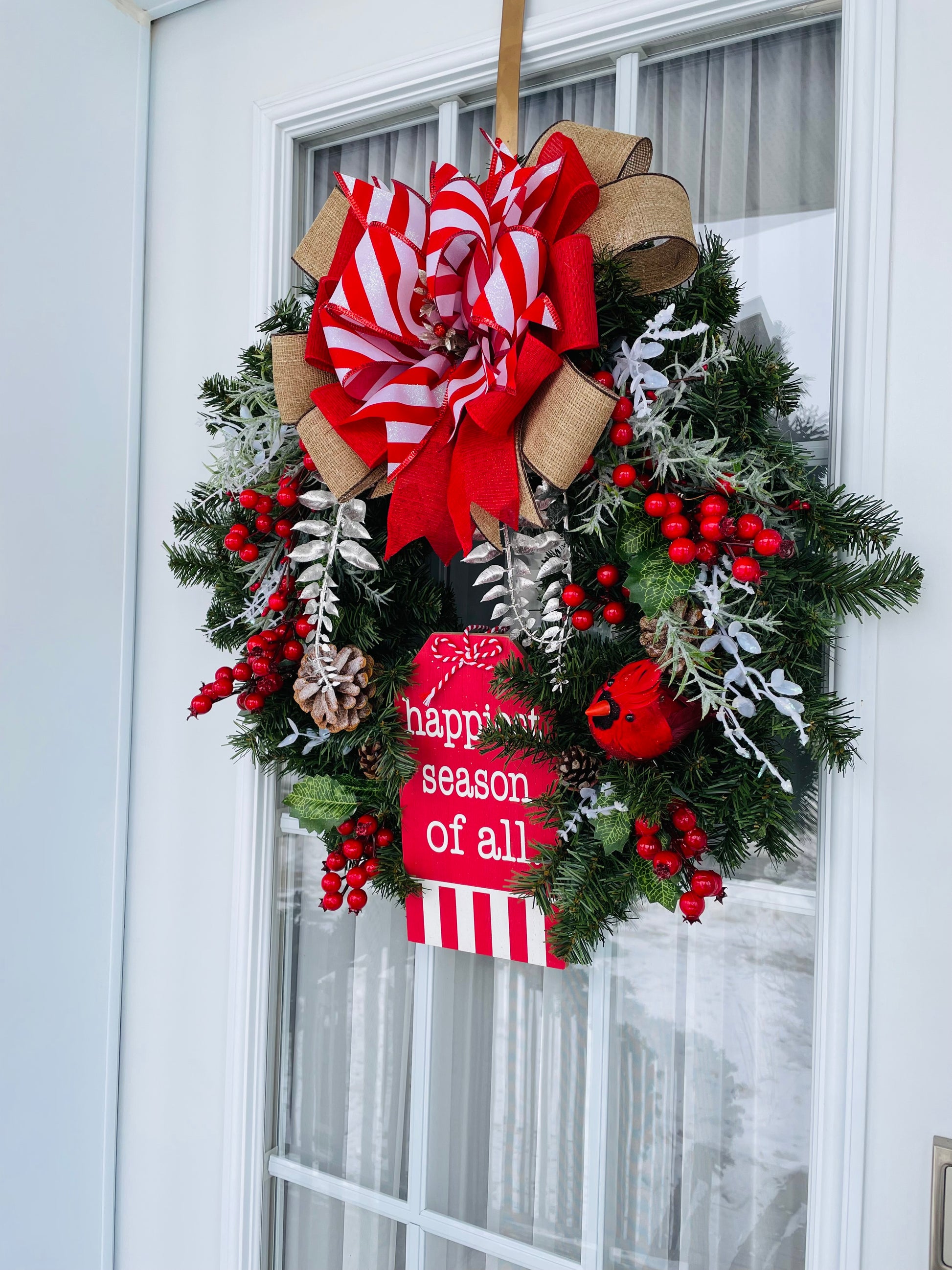 Couronne de NOËL 24 pouces fait a la main avec matériaux neufs sur couronne de sapin artificiel avec sont Cardinal et ornements rouge.