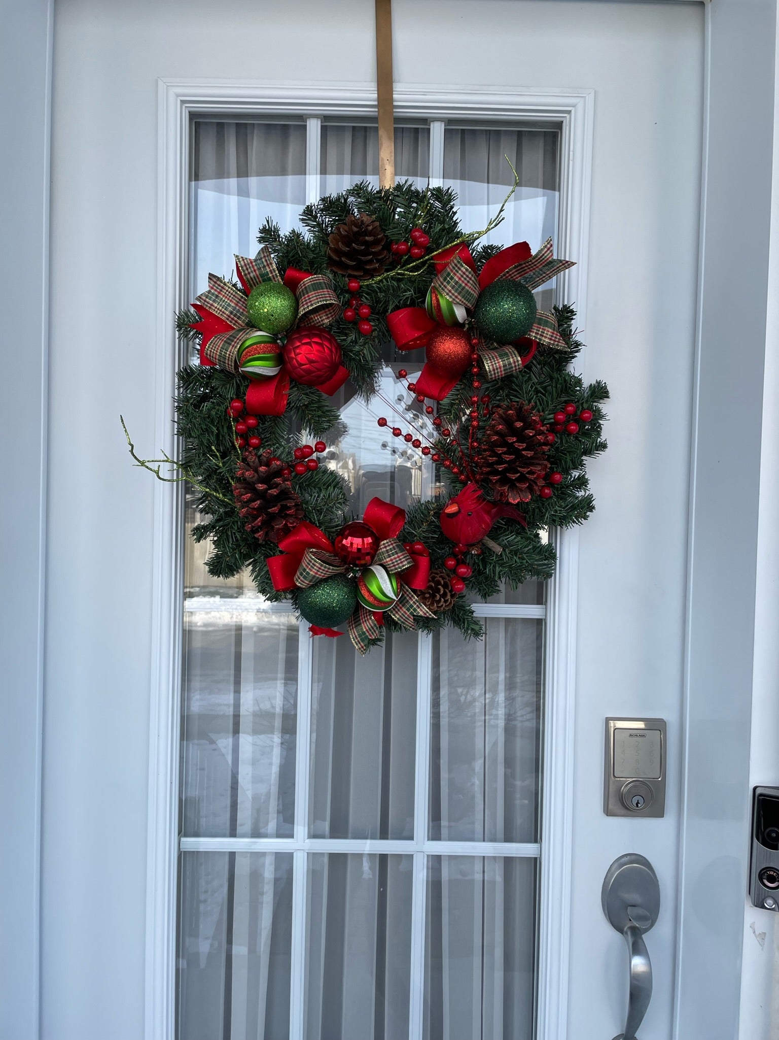 Couronne de NOËL 24 pouces fait a la main avec matériaux neufs sur couronne de sapin artificiel et ses ornements