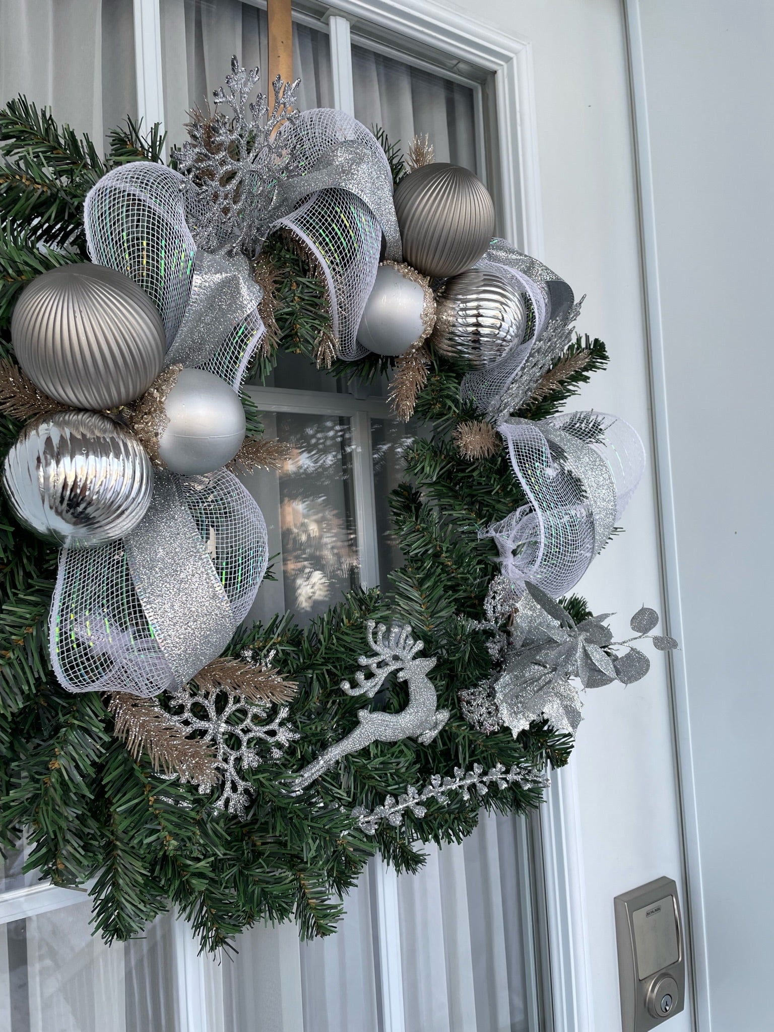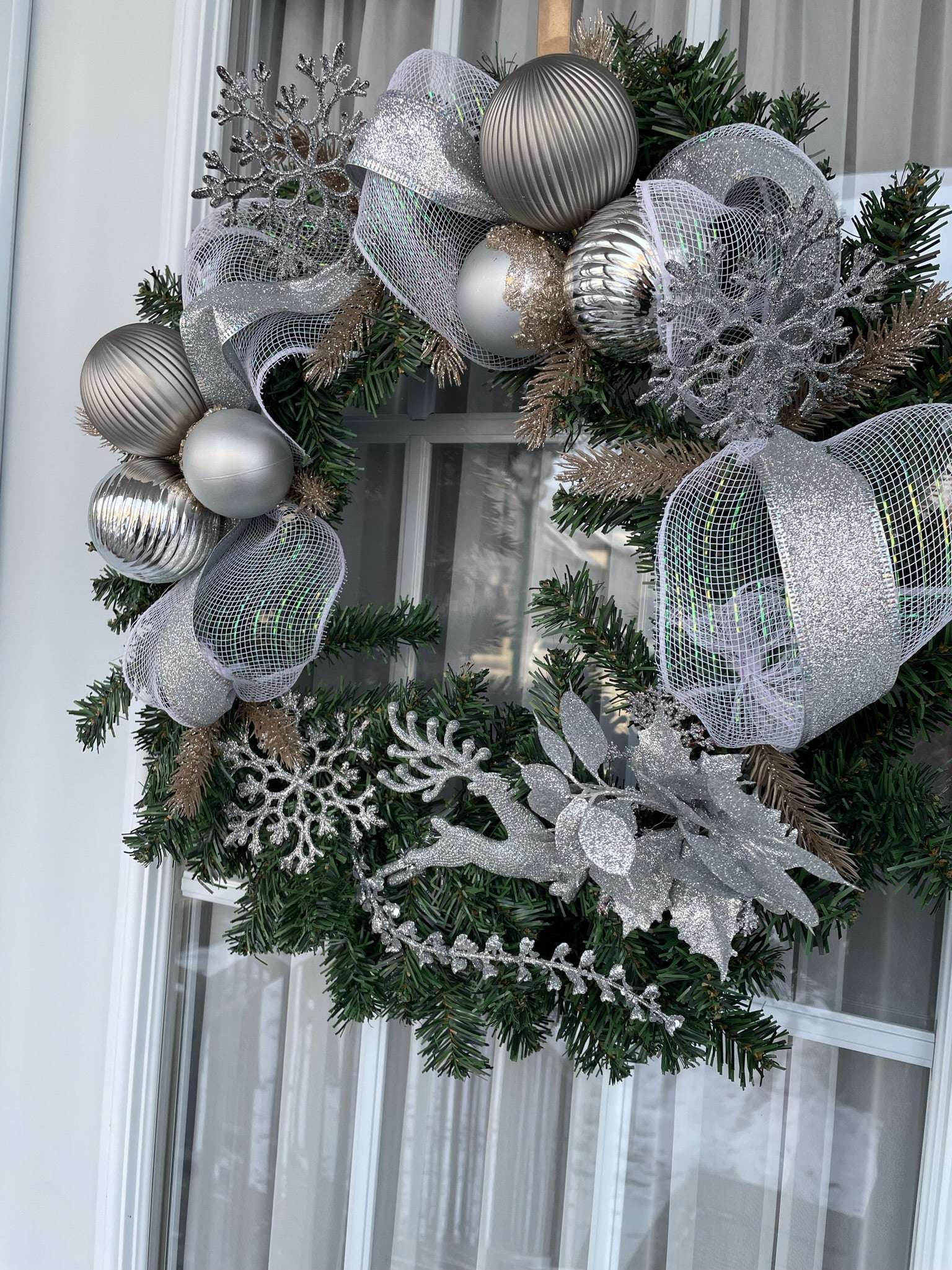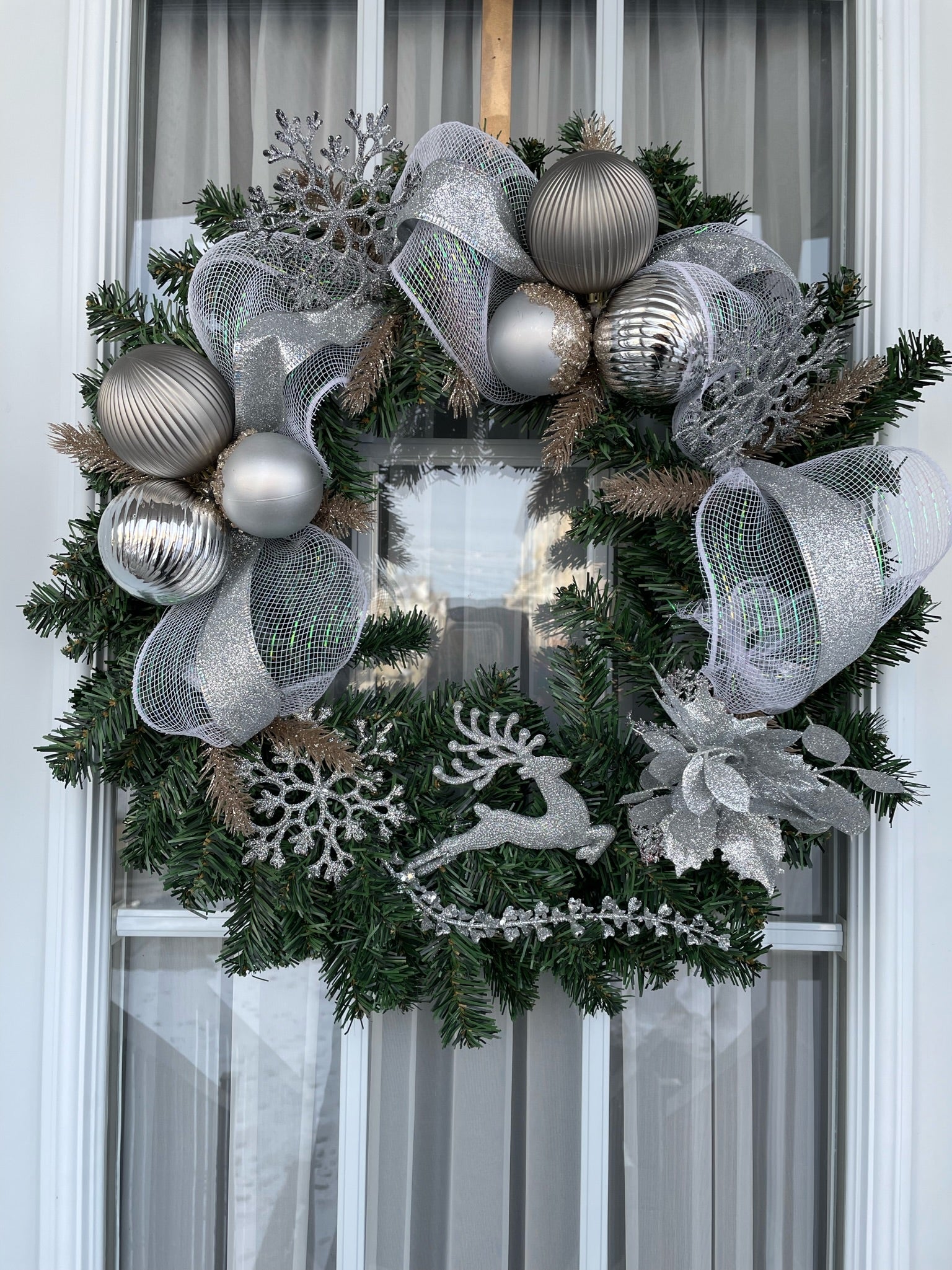 Couronne de NOËL 24 pouces fait a la main avec matériaux neufs sur couronne de sapin artificiel et ses ornement.