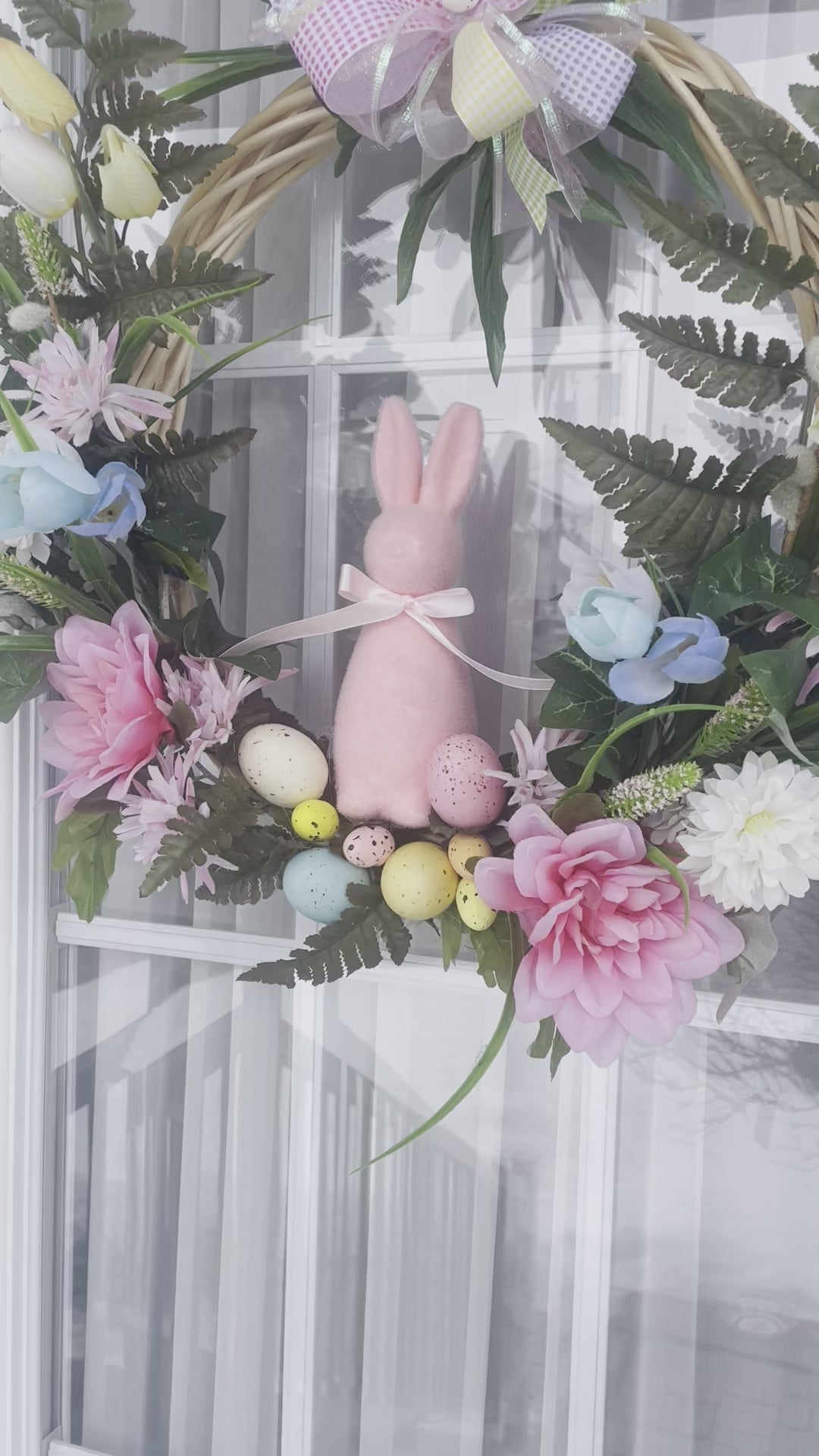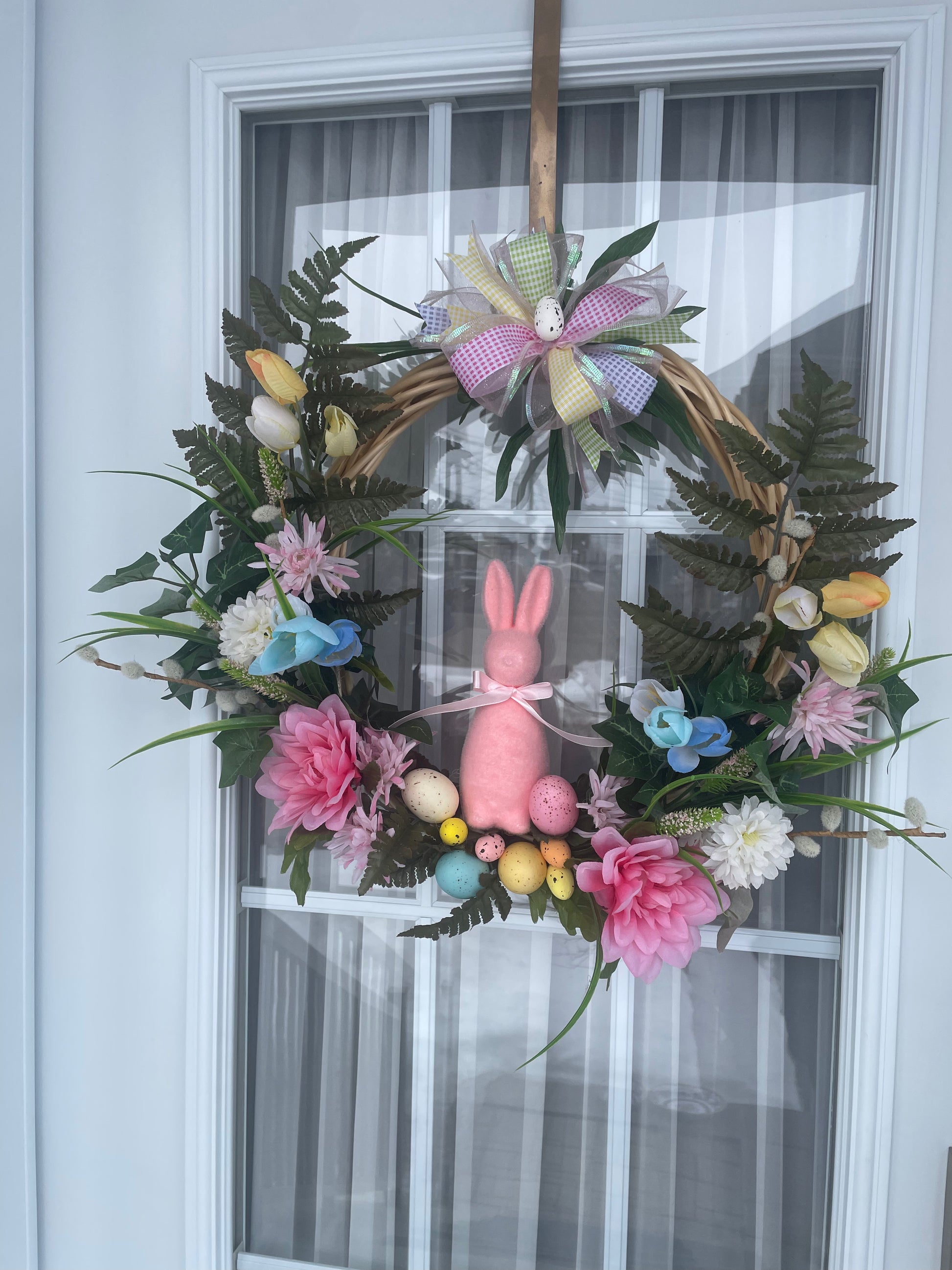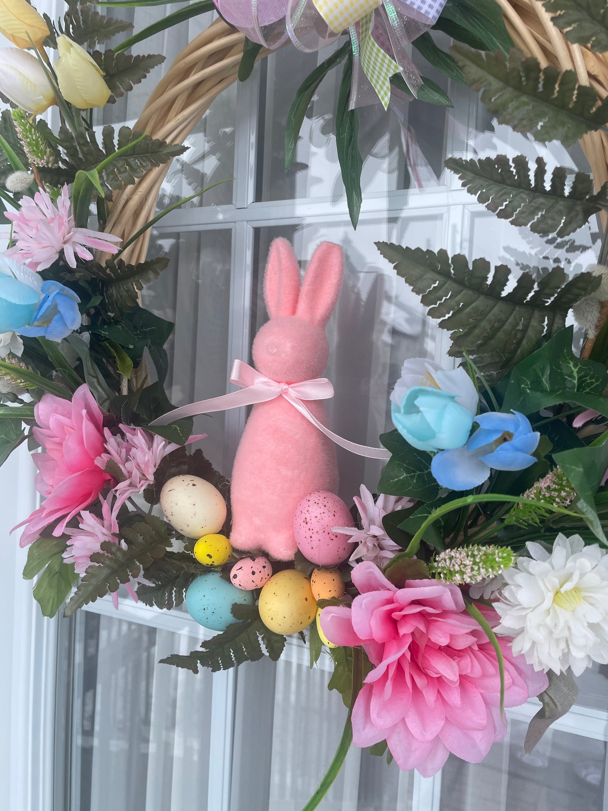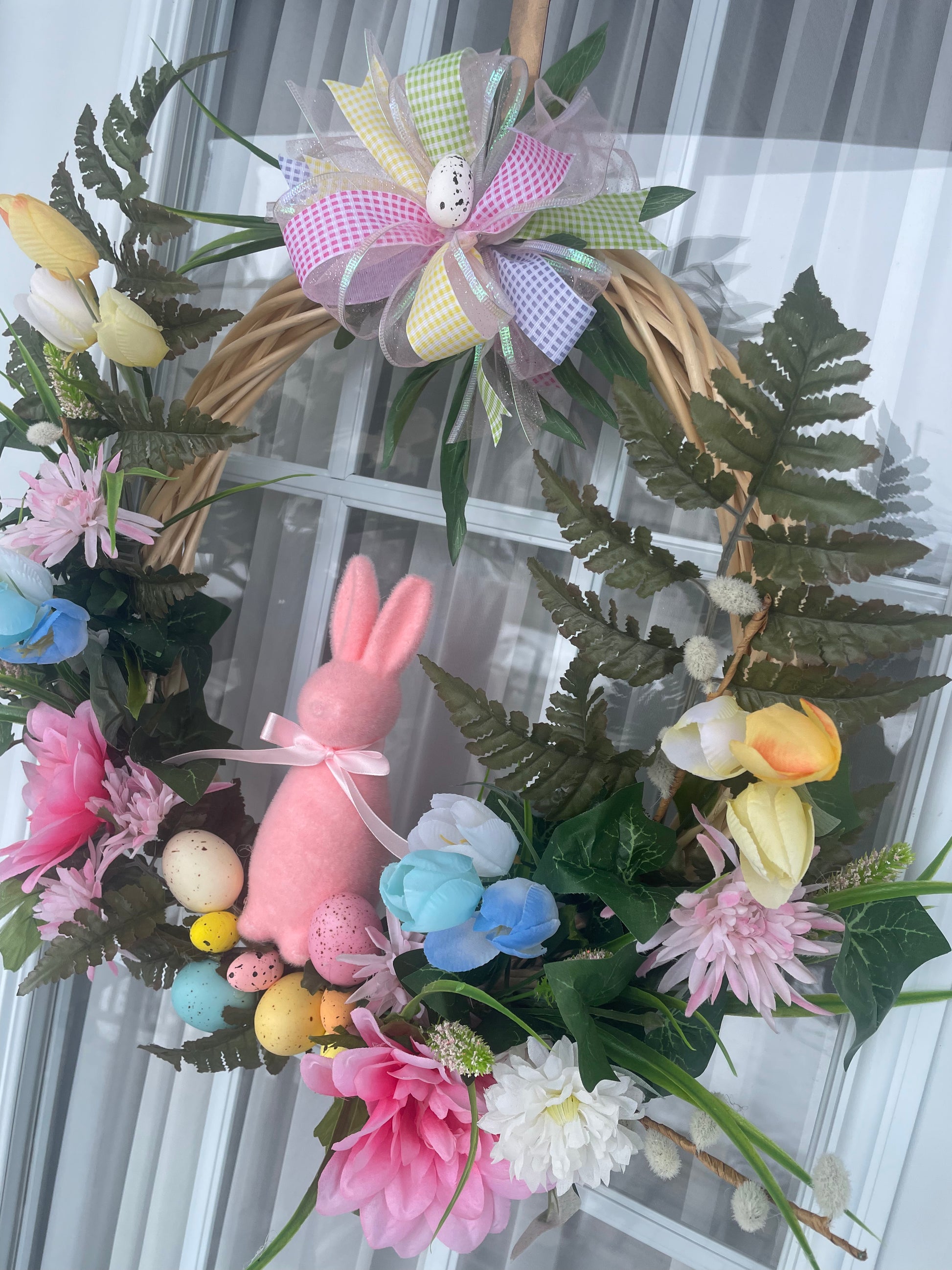Couronne 18 pouces avec son lapin rose dans ses coco de paques fait a la main avec matériaux neufs sur couronne de vigne naturelle.