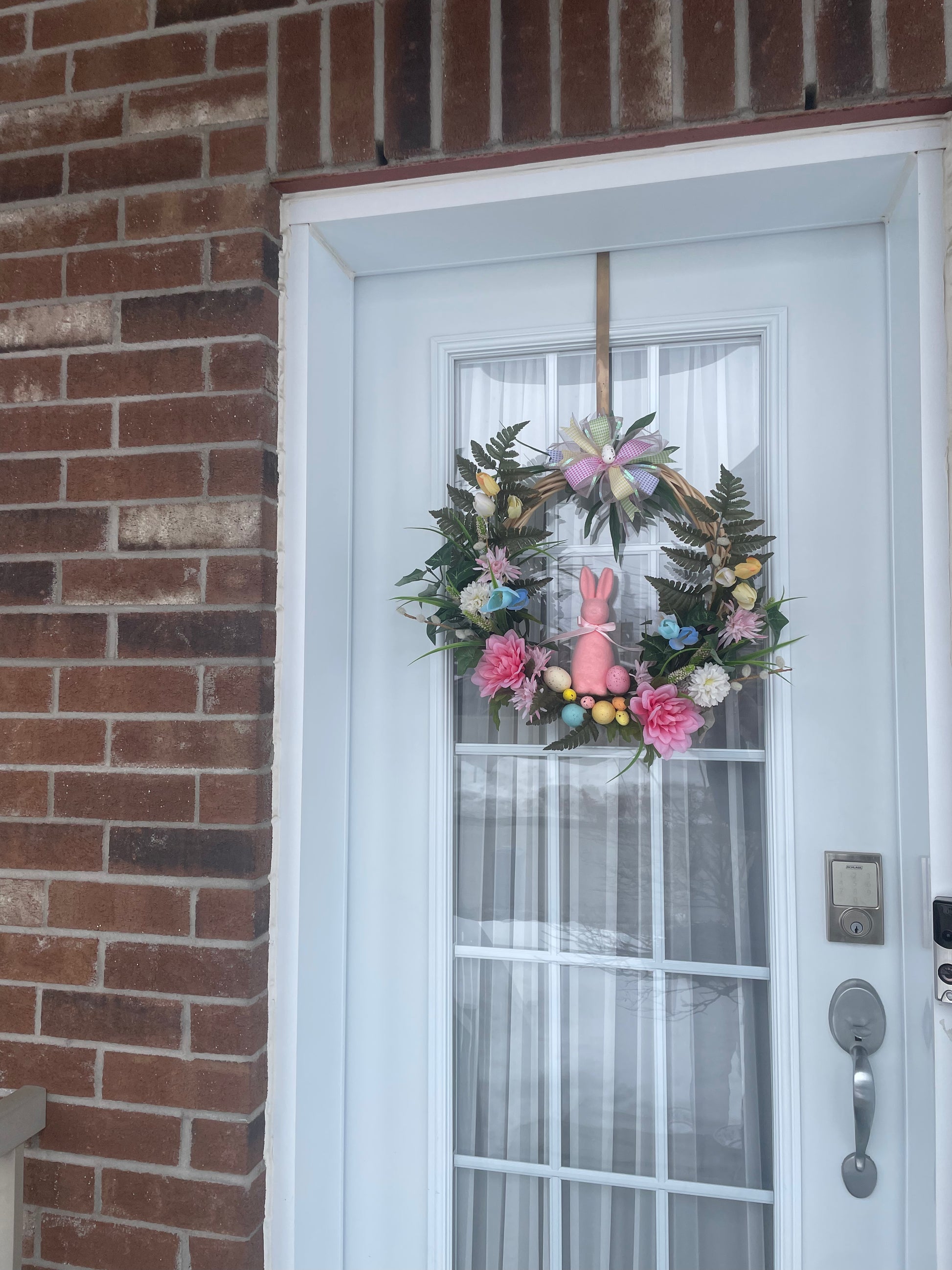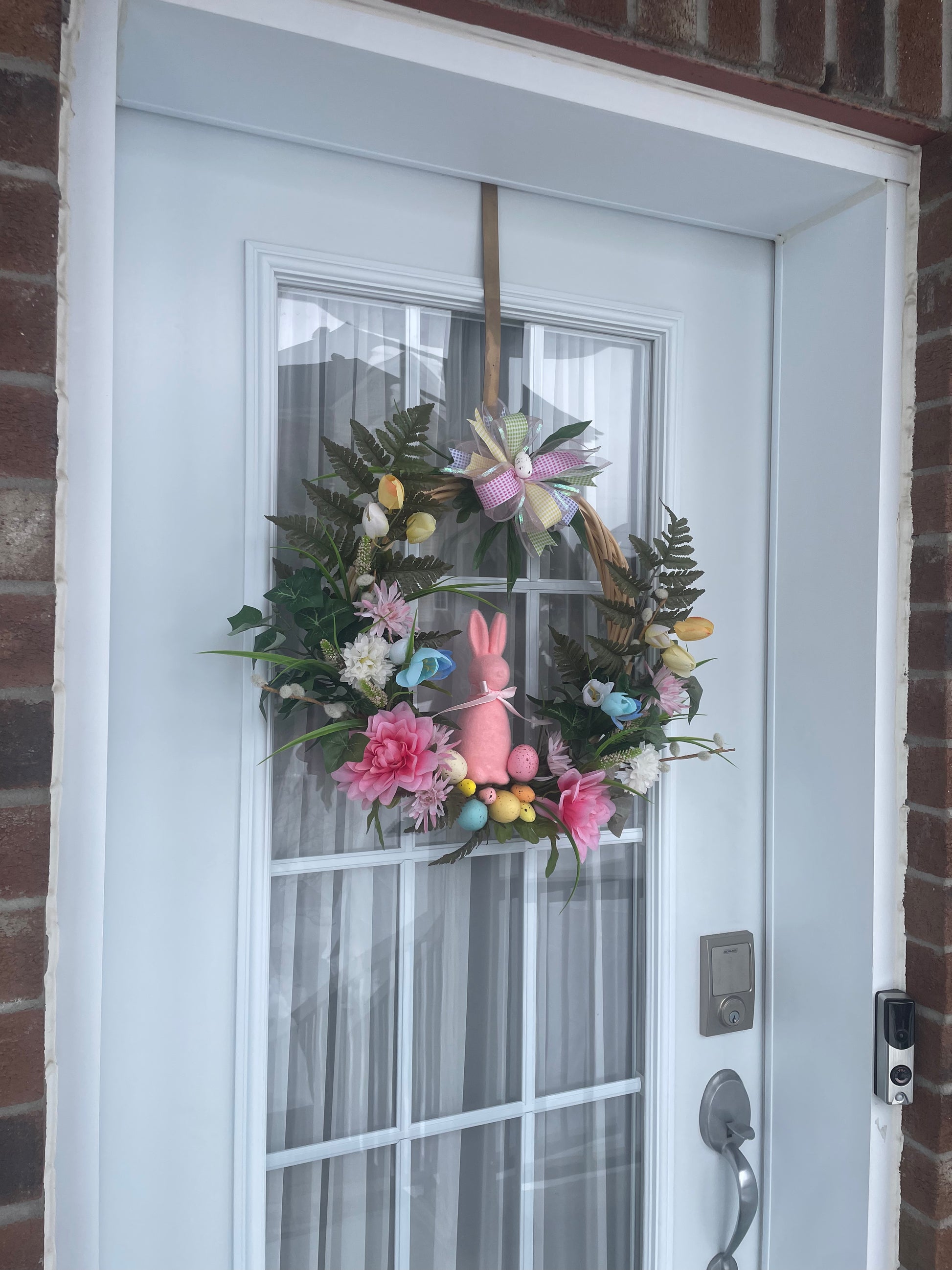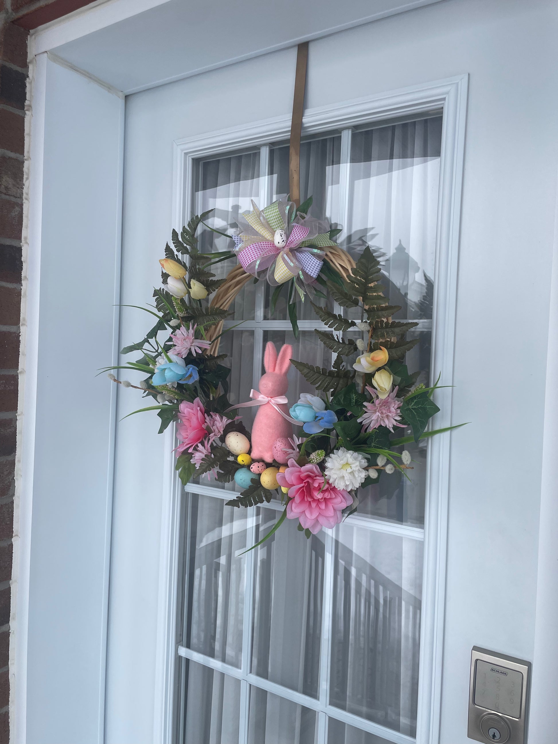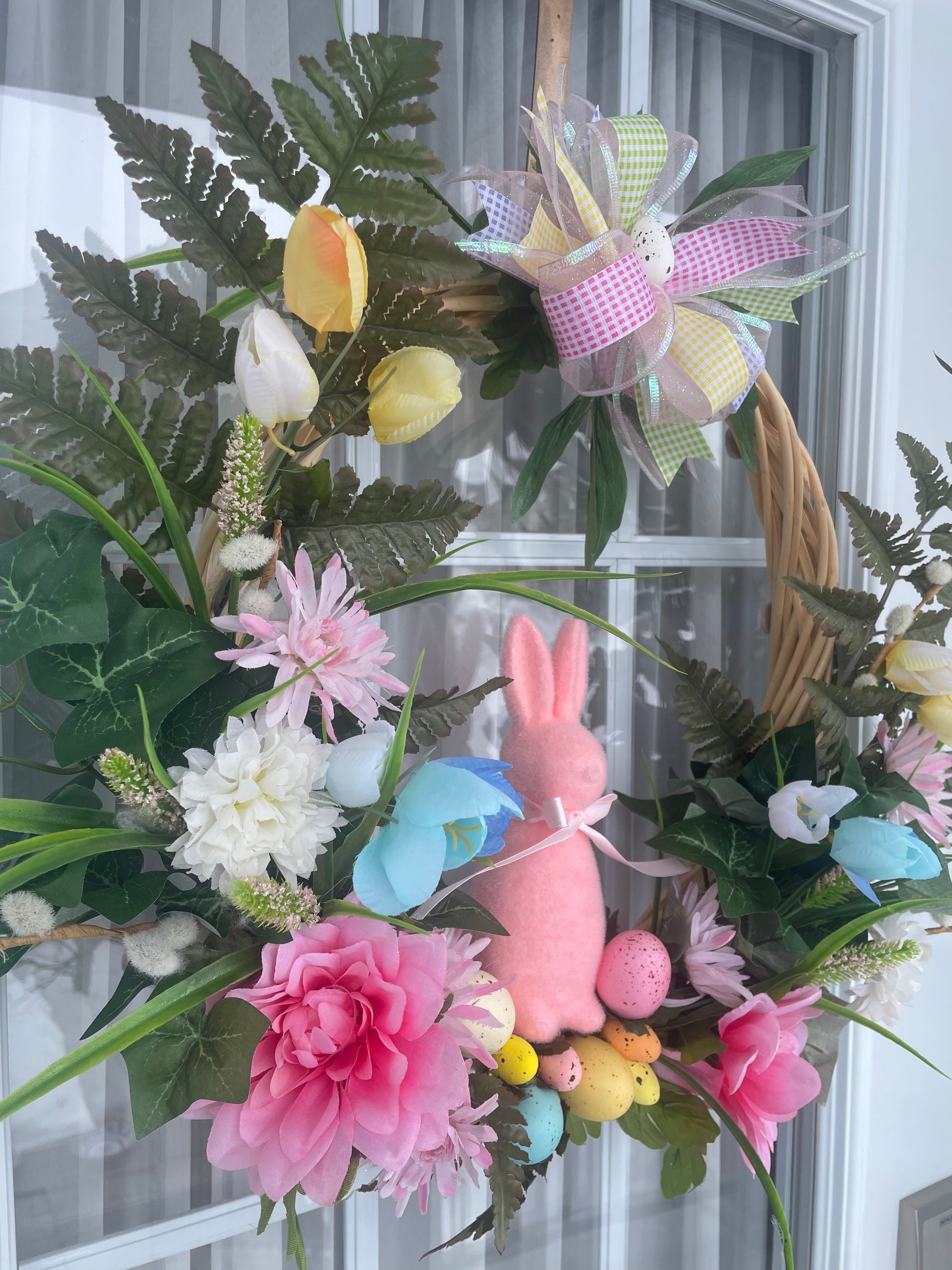Couronne 18 pouces avec son lapin rose dans ses coco de paques fait a la main avec matériaux neufs sur couronne de vigne naturelle.