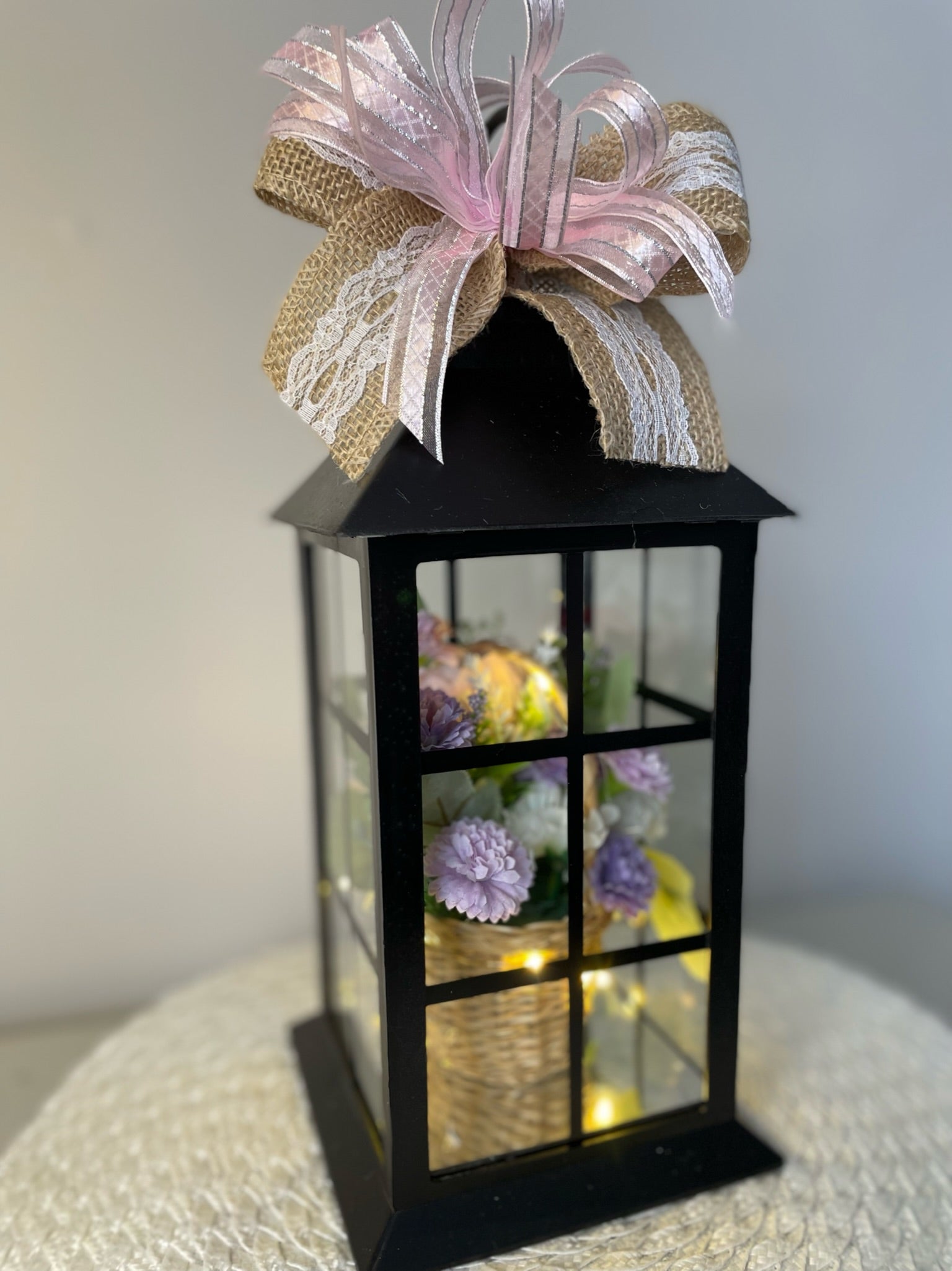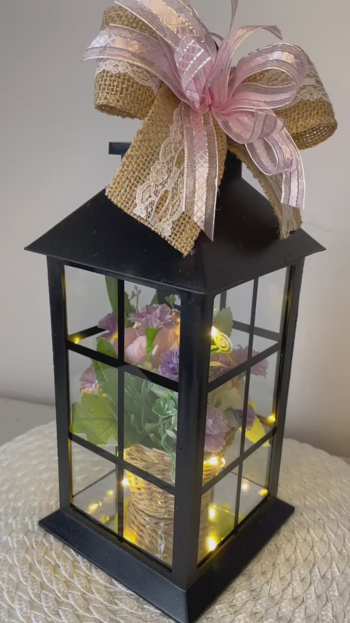 Cette lanterne décoré d'un petit panier de fleurs artificiel et avec lumière intégré sera embellir un petit coin de votre maison ou celle d'une personne cher !