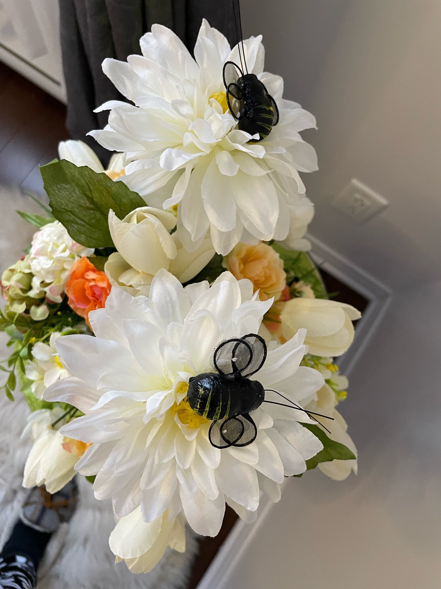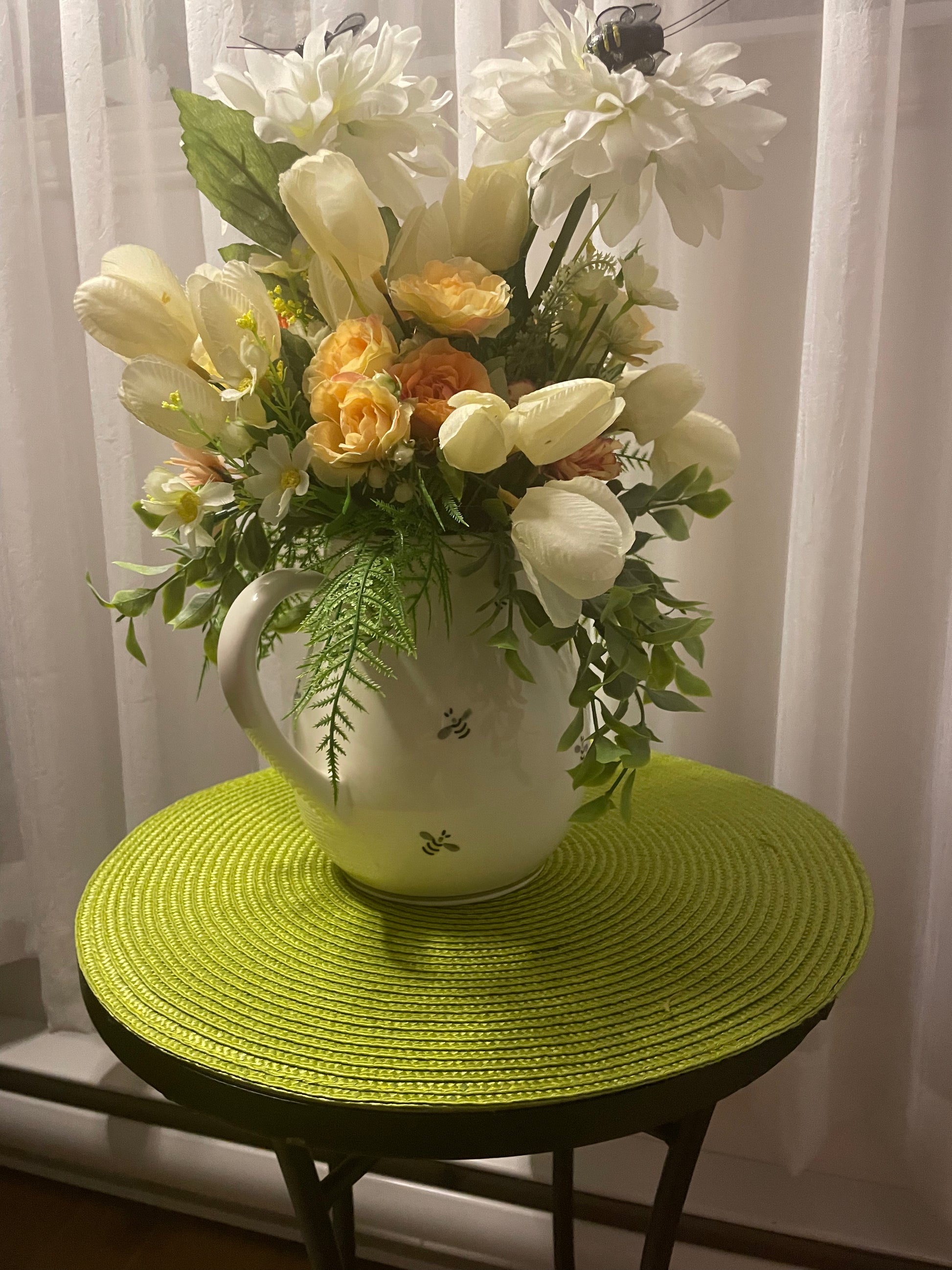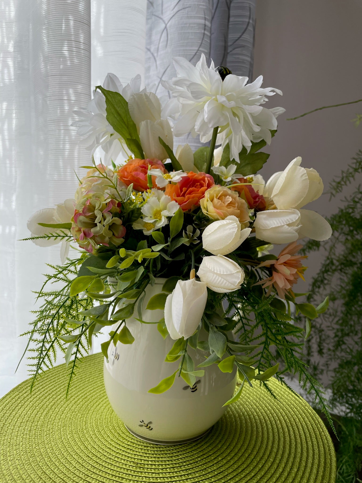 Les abeilles dans ce superbe vase en forme de pichet fabriqué au Portugal contenant une belle arrangement de fleurs artificiel apportera un peu de piquant dans votre maison ou dans la vie d'une personne qui vous est cher !